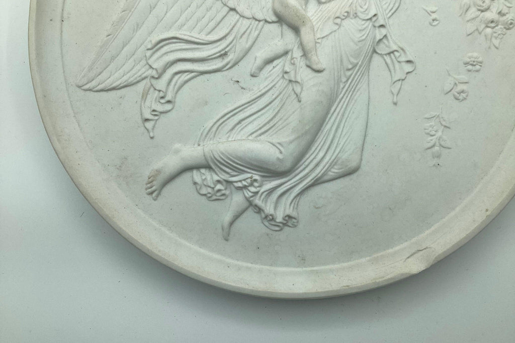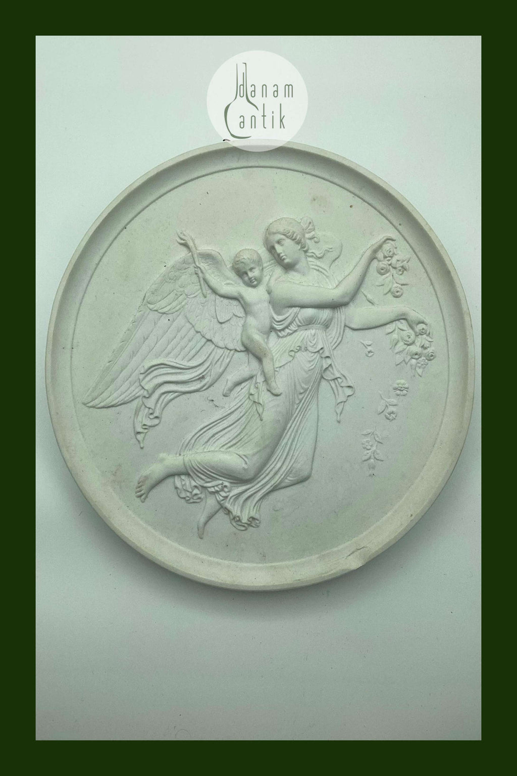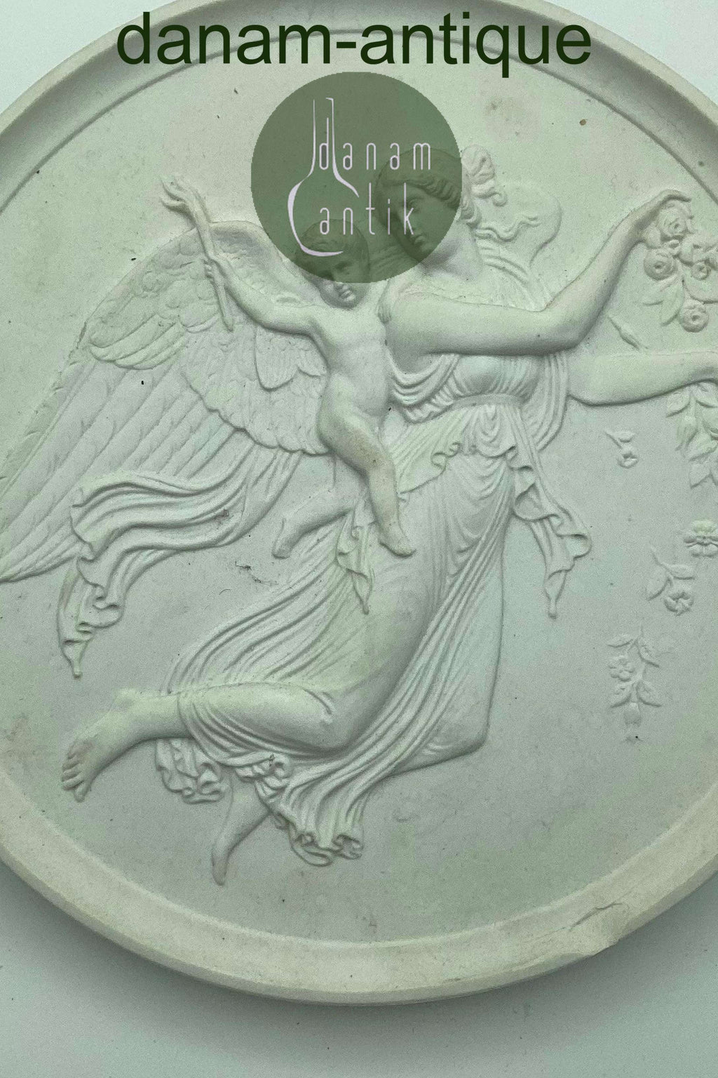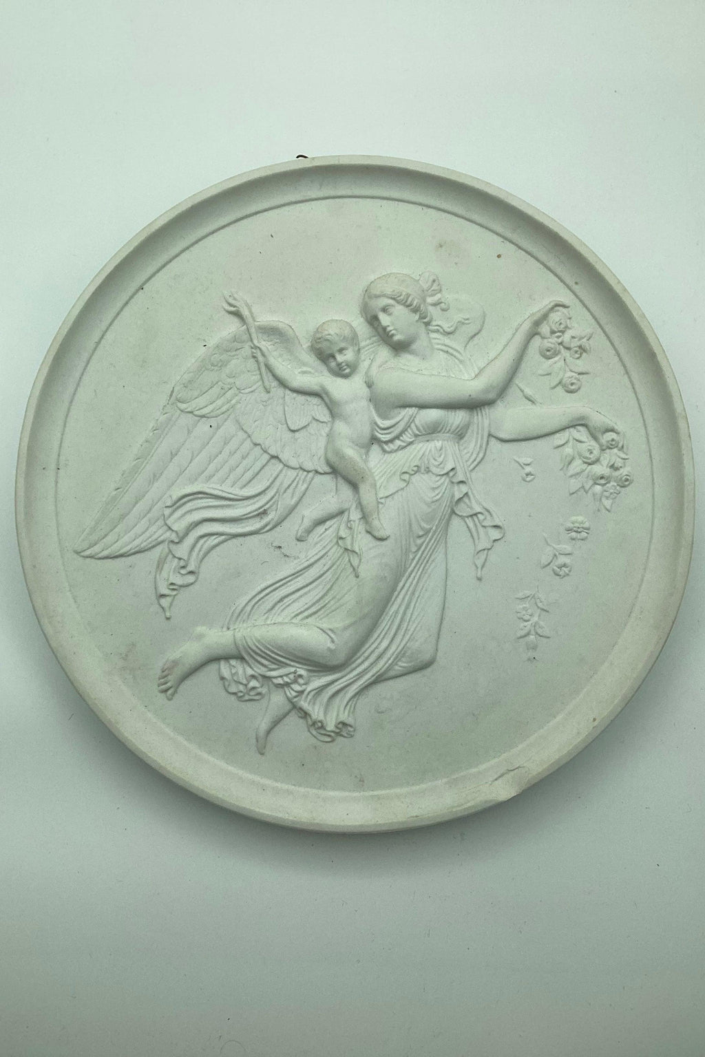 Bertel Thorvaldsen: Royal Copenhagen Biscuit Platte "Dagen". Kopi fra 1840 after Thorvaldsens original fra Rom 1815. Måler 26cm (10.23 inch). På kanten nederst et skår ! Fremstillet i slutningen af 19. århundrede.
