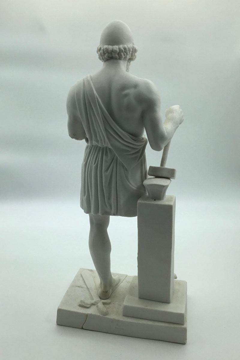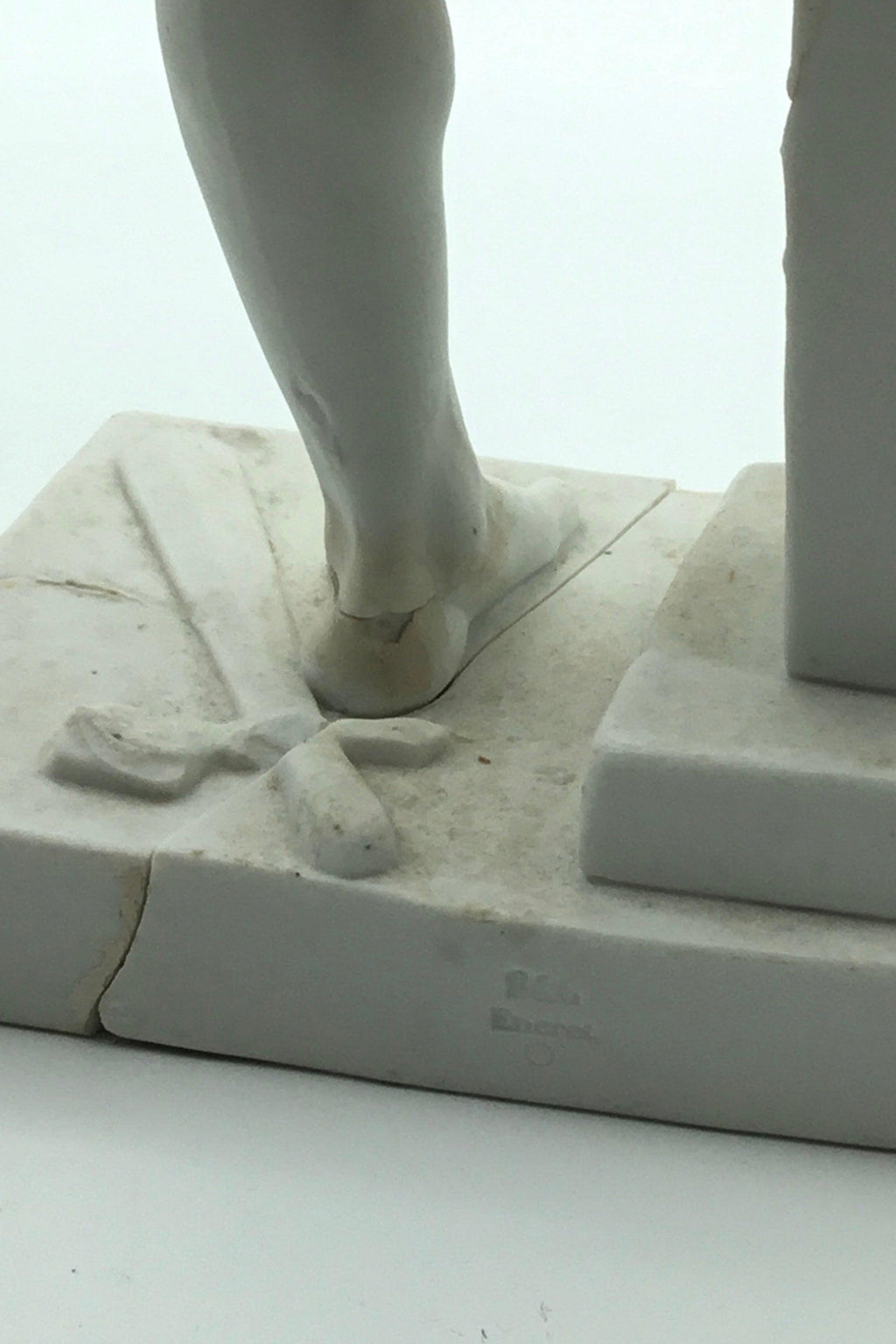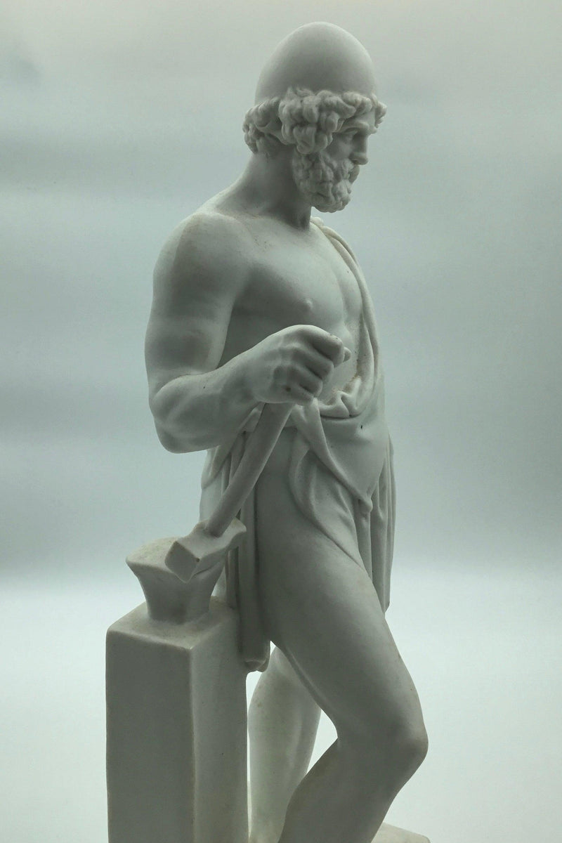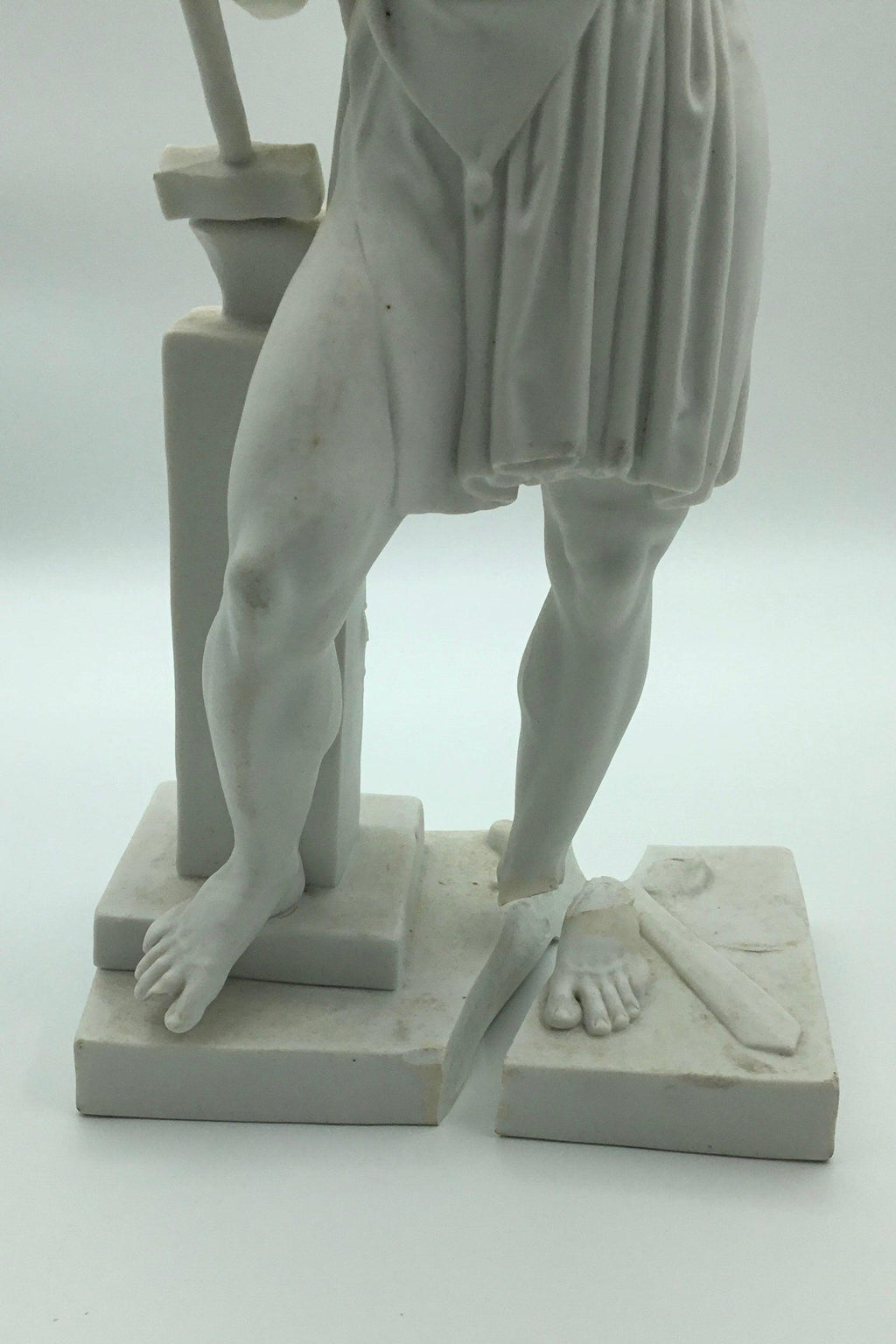 Bertel Thorvaldsen: Royal Copenhagen. Figur i bisquit af Vulcan. Fremstår defekt. Soklen i to dele. Løs arm, dog uden tang, medfølger.  Måler 37cm (14,56 inch)