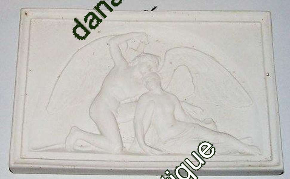 Kgl. Porcelæn Biscuit Platte Amor opvækker den afmægtige Psyche No 78. Kopi af Th. Mule 1847 efter Thorvaldsens original fra Montenero 1810. Måler 15 x 9cm. Royal Copenhagen