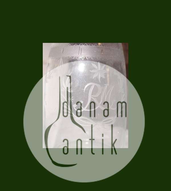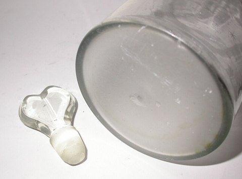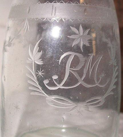 Karaffel fra begyndelsen af 1800-tallet. Smukt dekoreret med stjerner og bladværk samt ejerinitialer R.M. Almindeligt brugsslid gennem mange år. Ingen skader eller reparationer. Hjerteformet prop. Typisk for perioden 1800-1830