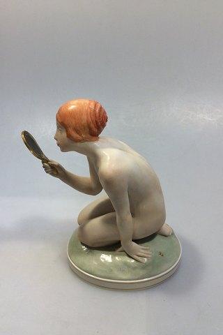 Royal Copenhagen Figur af pige med spejl No 1244. Designet af Gerhard Henning. Dateret 7-12-1923. 2. sortering. Måler 18 cm