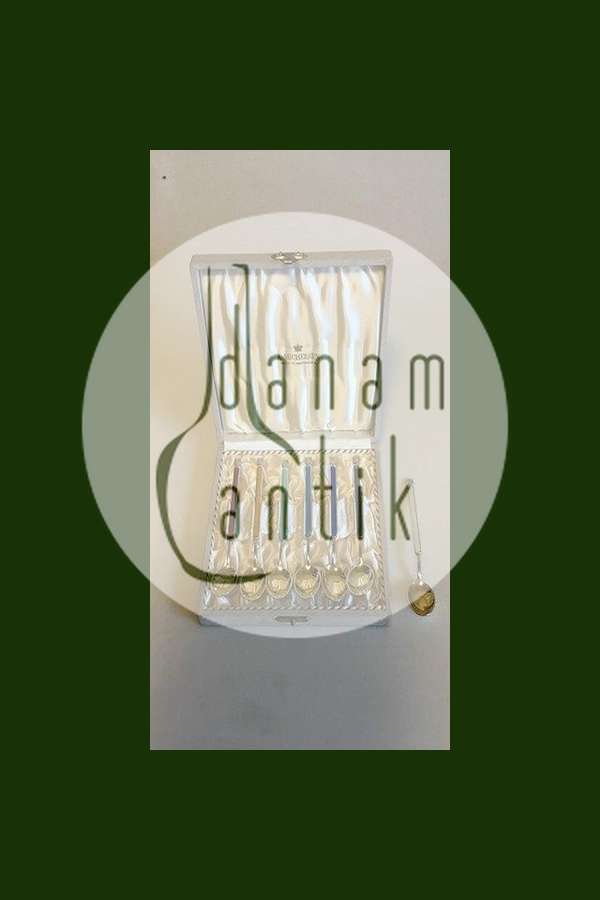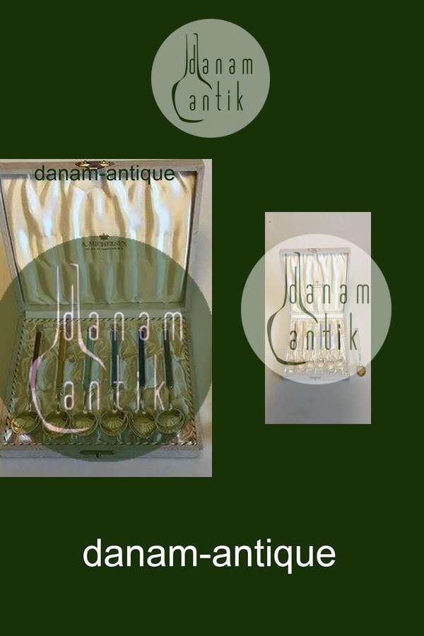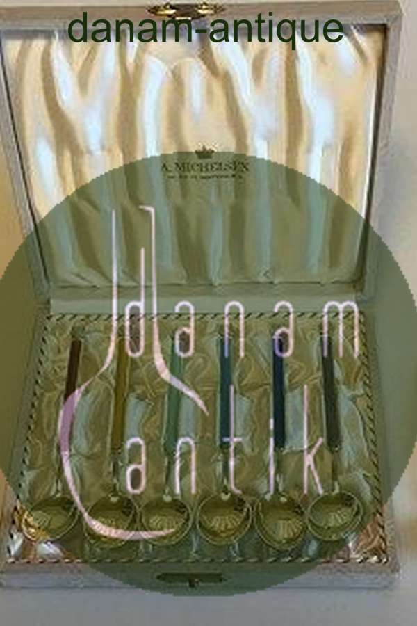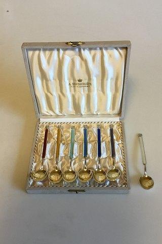 A. Michelsen Sæt af 6 Forgyldte Sterling sølv theskeer med farvet Emalje i æske, plus en ekstra