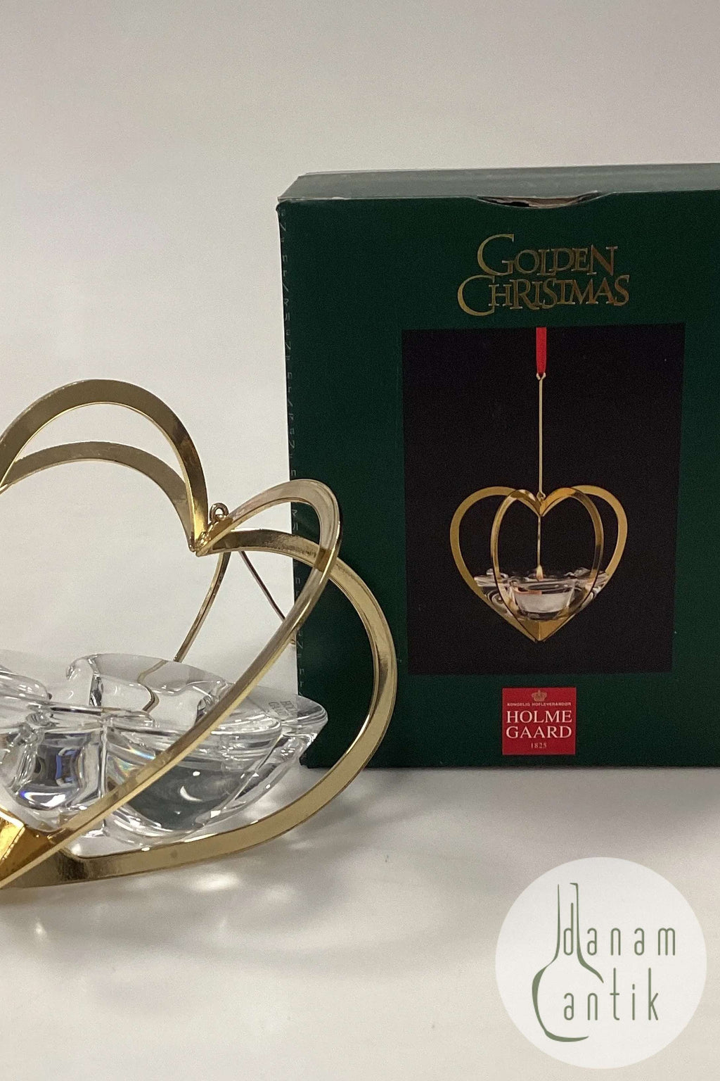 Holmegaard Golden Christmas Fyrfadslysetage i hjerteophæng fra 2005. Designet af Jette Frölich.
