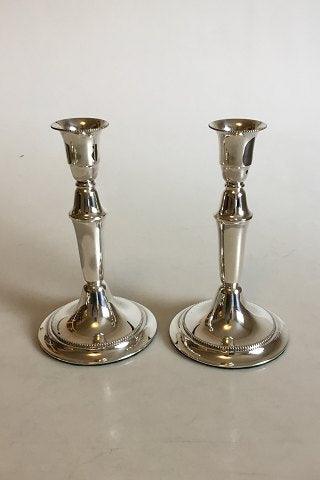 English Silver House Copenhagen Sterling Sølv Par lysetager. Måler 17 cm. Vejer 405 gram tilsammen. Bunden udfyldt