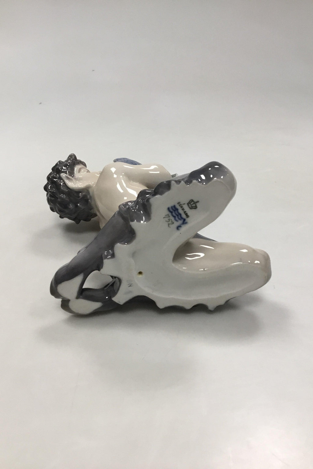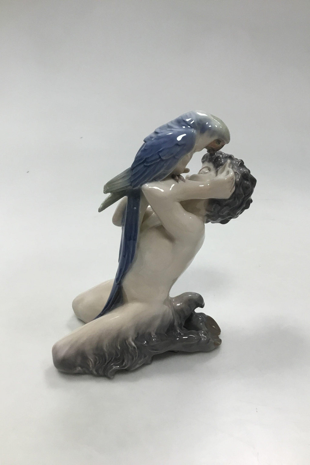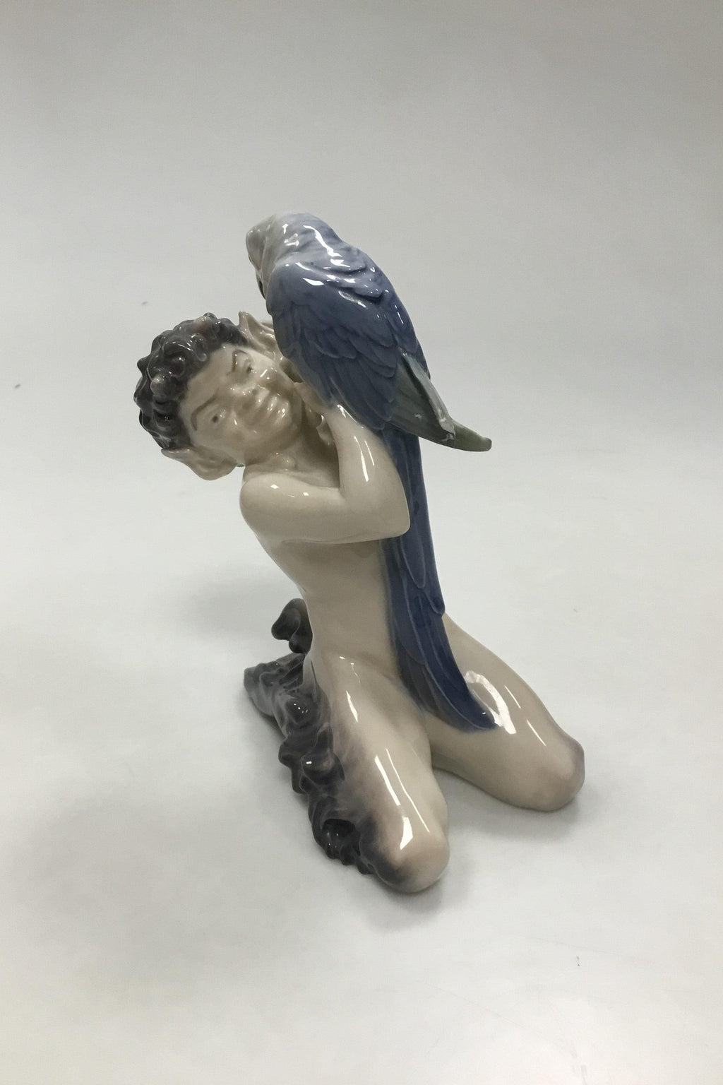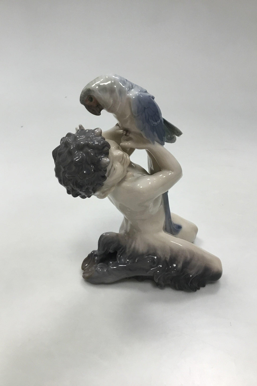 Royal Copenhagen Figur Faun med Papegøje No 752. Måler 19 cm (7 31/64 in). Papegøjen har dog brækket en vinge, ellers i fin stand.