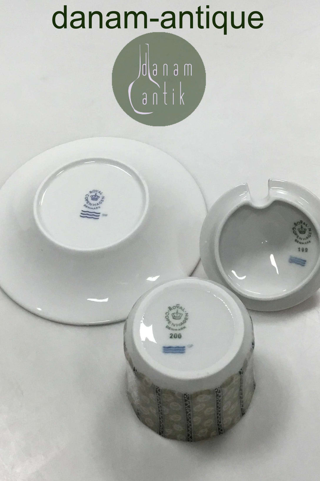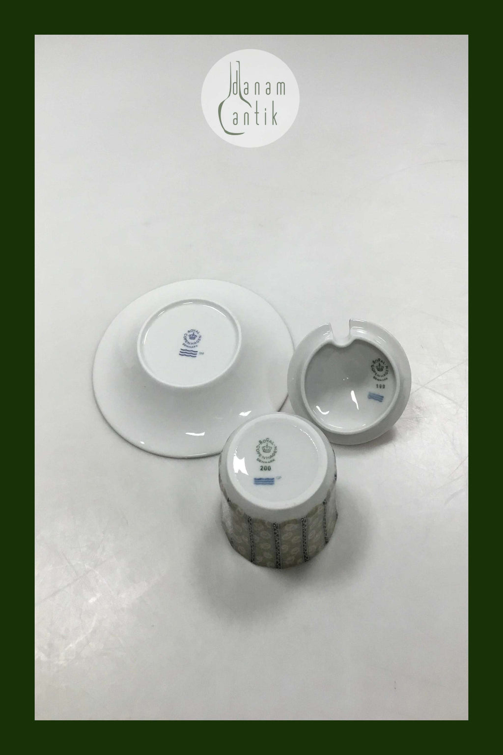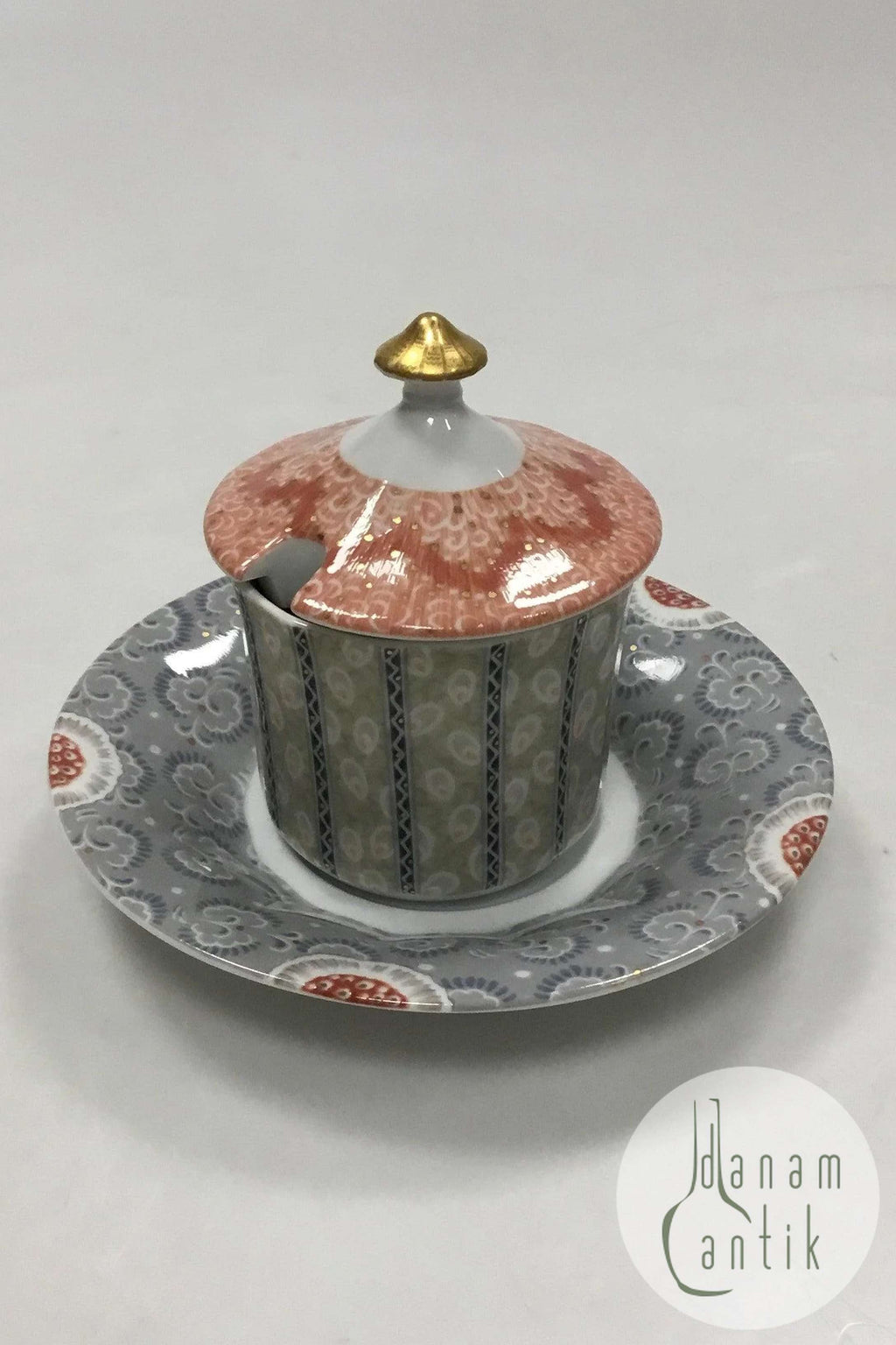 Royal Copenhagen Fairytale Sennepskrukke No 200 med låg No 199, og underskål No 198 i Grå/Terracotta. Krukke med låg måler 6,8 x 9 cm (2 43/64 x 3 35/64 in). Underskål måler 12,5 cm (4 59/64 in).