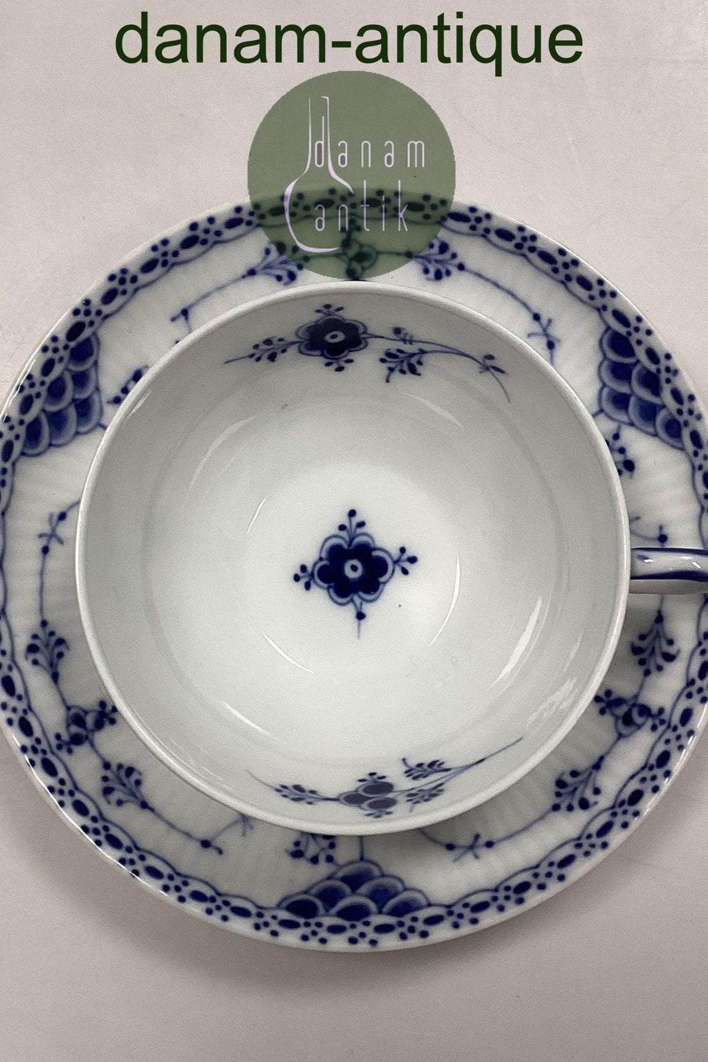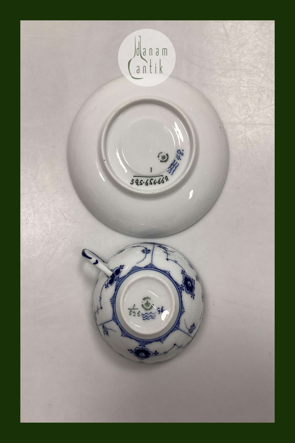 Royal Copenhagen Musselmalet Halvblonde Tekop med indvendig dekoration og Underkop No. 525. Kop måler 4,5 cm x 10 cm / 1,77 in. x 3,93 in.