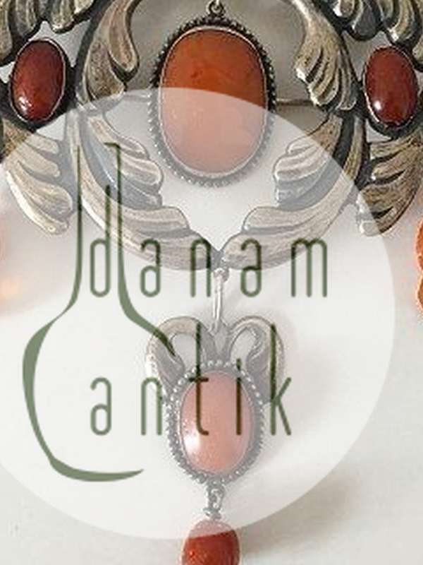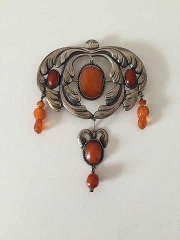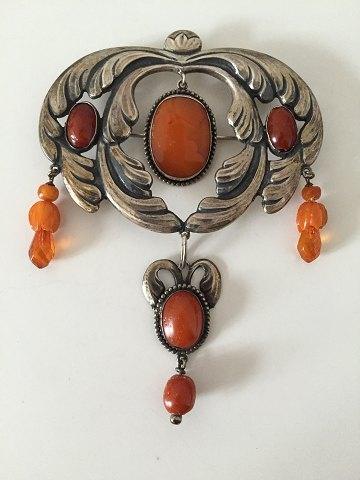 Art Nouveau unika broche fra 1910-1920 med ravsten. Ukendt kunstnermonogram.