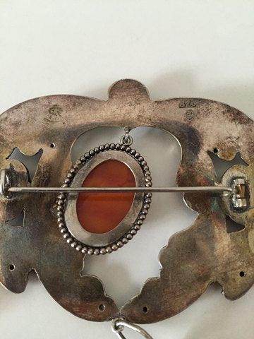 Art Nouveau unika broche fra 1910-1920 med ravsten. Ukendt kunstnermonogram. Måler 9 x 7cm. Vejer 25g