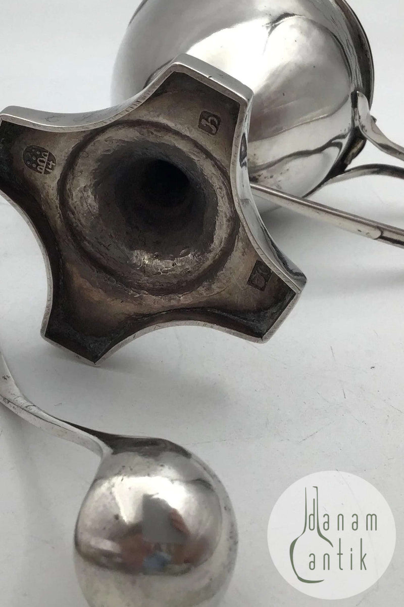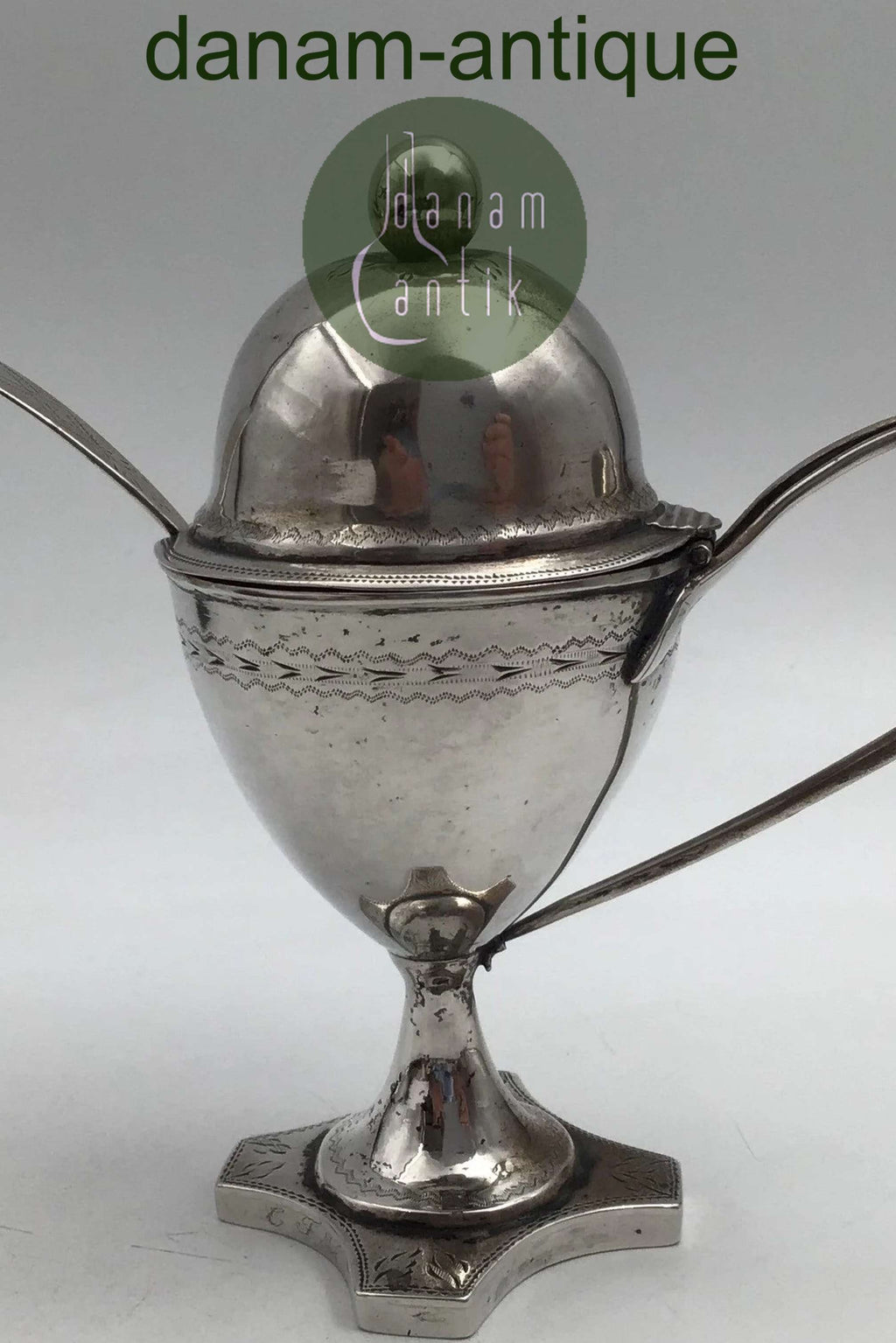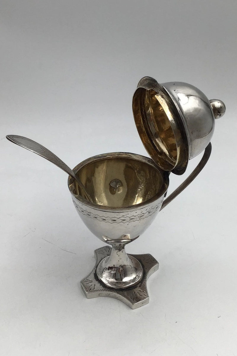 Dansk Empire Sølv Sennepsbæger med ske (1814) Måler H 13 cm (5.11 inch) Vægt 136 gr. (4.80 oz) Indvendigt Forgyldt (Aldersbetingede brugsspor incl bule og skade på hank)