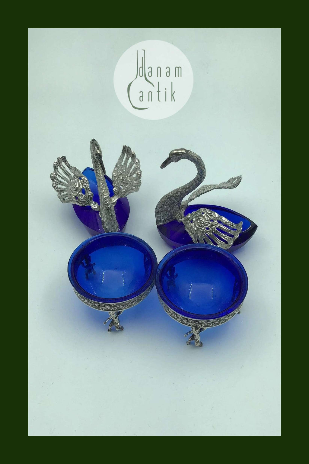 Tyske? Sølv Saltkar i blåt glas (4) To åbne  saltkar og to udformet som Svaner med bevægelige vinger Samlet vægt 216.7 gr 7.64 oz