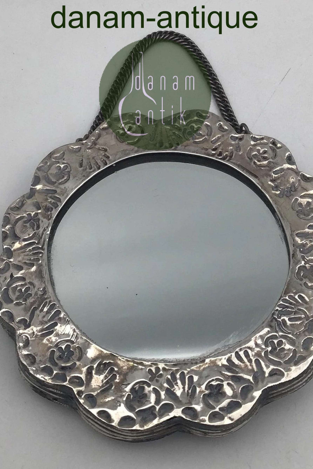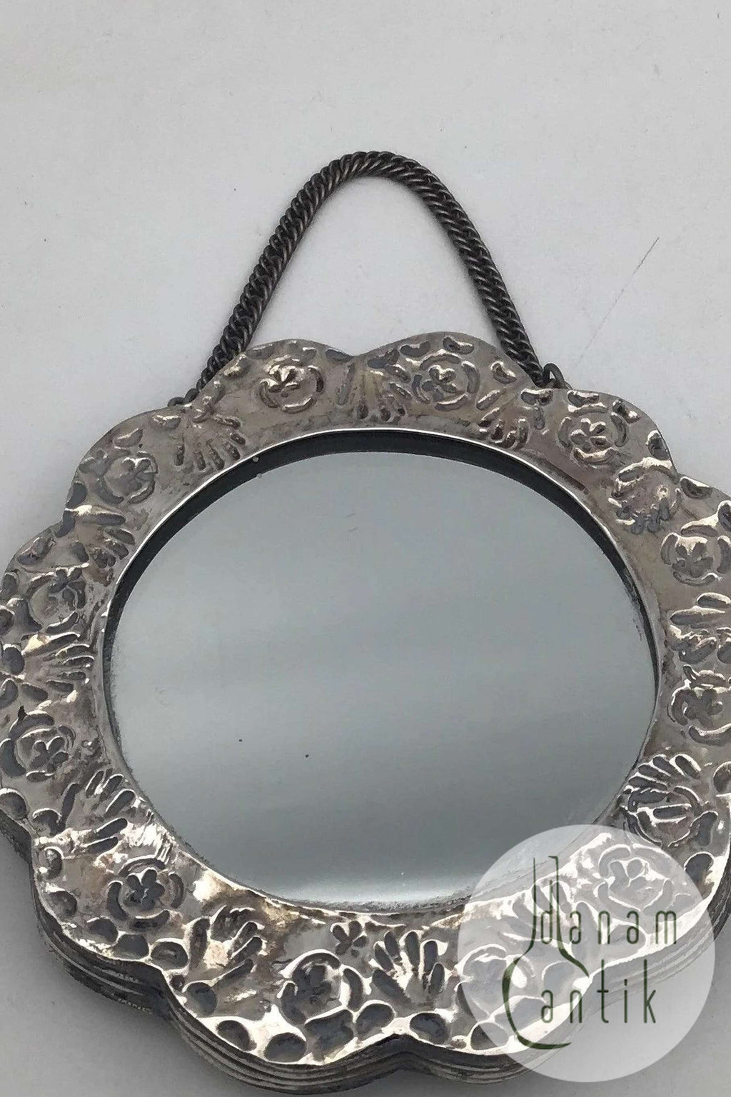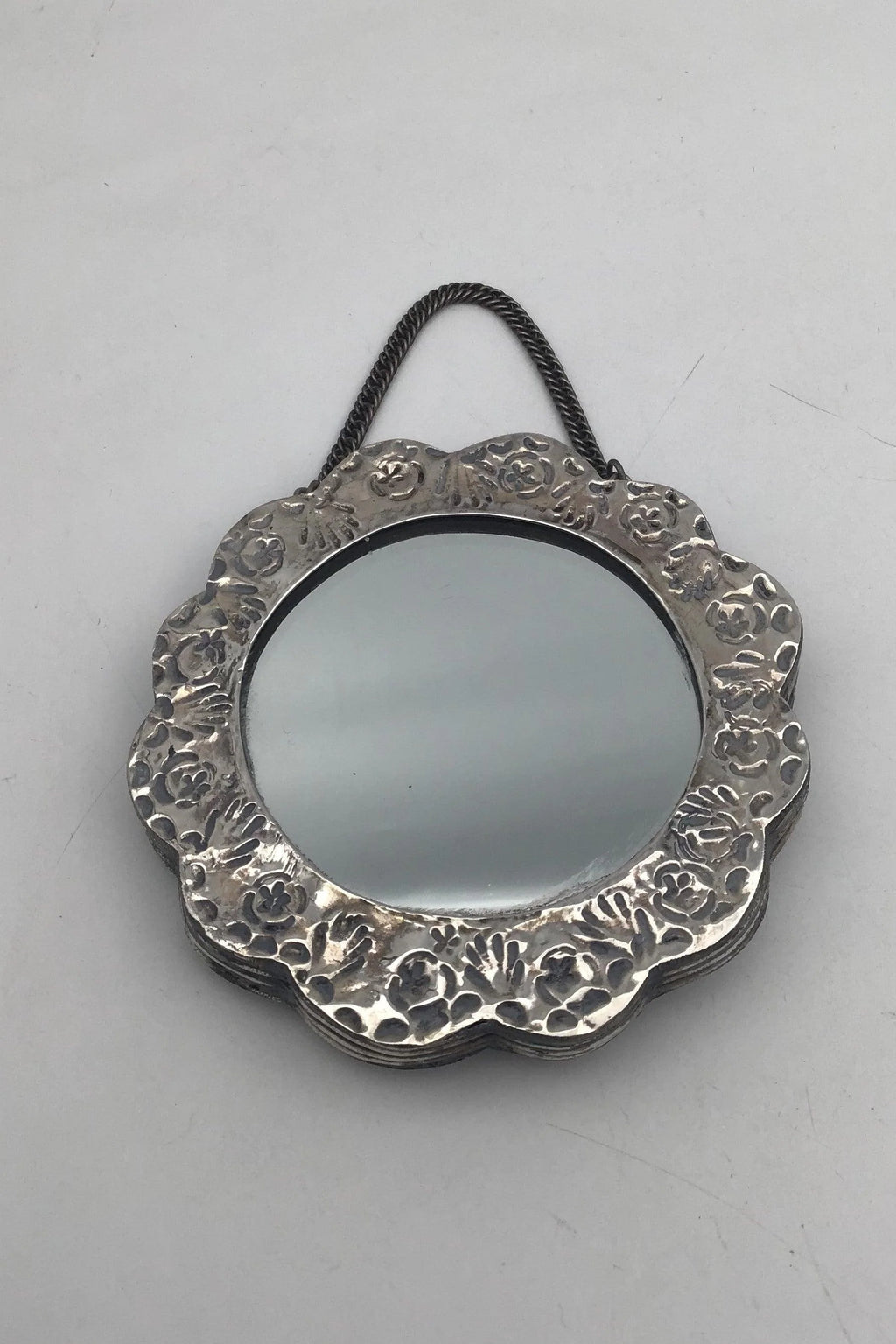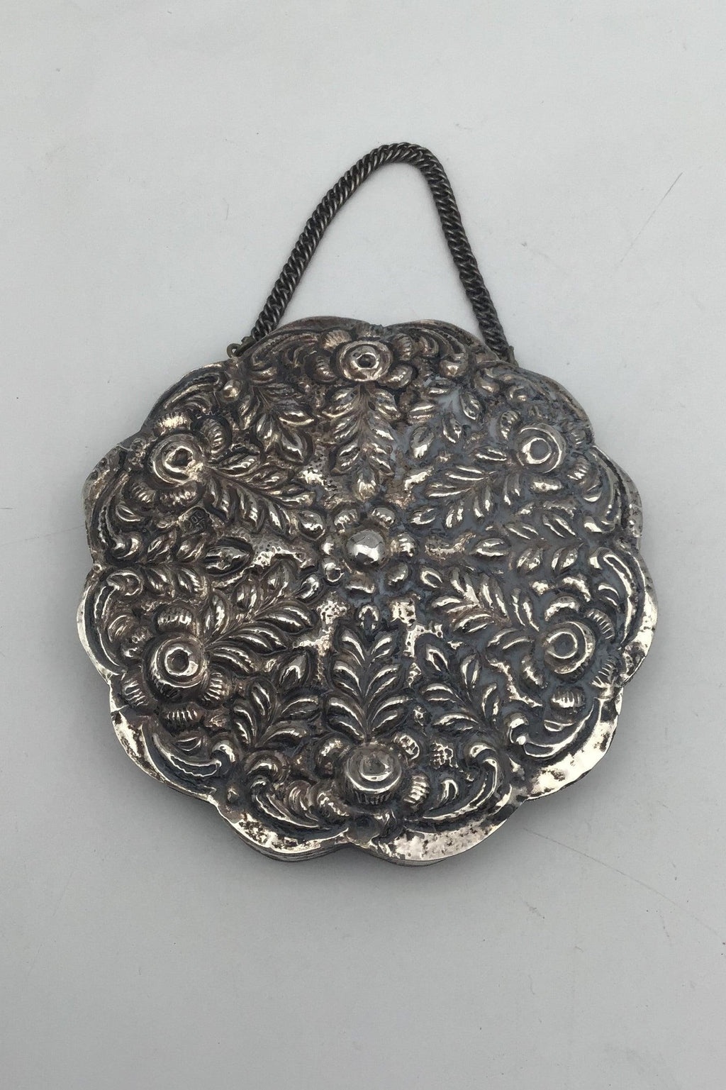 Sølv Taskespejl med kæde Måler Diam 9.5 cm (3.74 inch) Vægt 113 gr (4 oz) (OBS Ikke Stemplet)