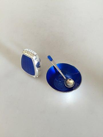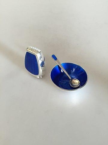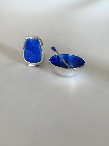 Anton Michelsen Salt & Pebersæt i Sterling Sølv med blå emalje. Samlet vægt 48 g. Peberbøsse måler 5 cm i højden. Saltskålens diameter måler 5 cm. Fremstår i fin stand.