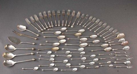 Georg Gleerup. Sølvbestik af sølv, hammerslået laf, snoet sølvtråd, der leder på til stiliseret blomst, stemplet "GGI HAANDSMEDET" samt københavnerstempel med årstal, eller G. Gleerup sterling 925. Bestående af; 12 gafler L. 20,5 cm, 12 skeer L. 16 cm, 11 gafler L. 16 cm, 17 teskeer L. 11,5 cm, 3 saltskeer L. 9 cm, 6 pålægsgafler L. 13 cm, 14 dele div. ta-ting