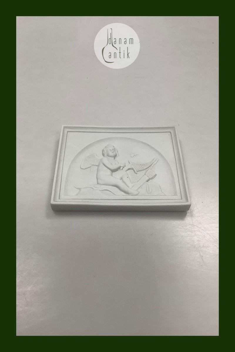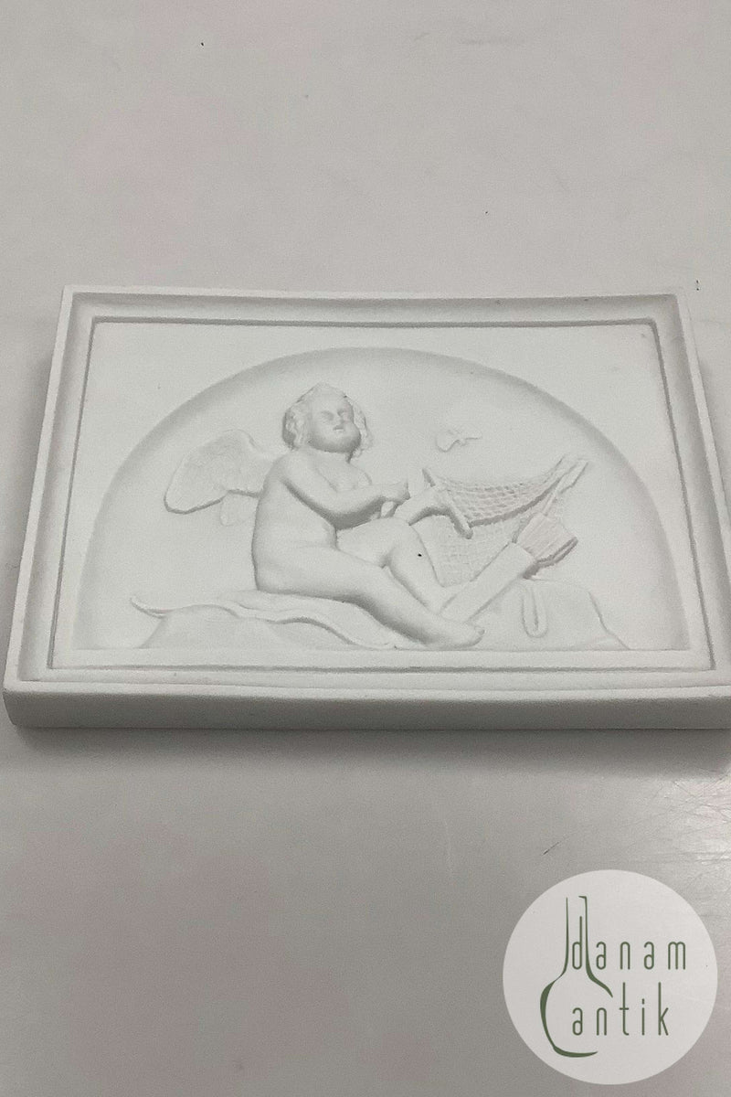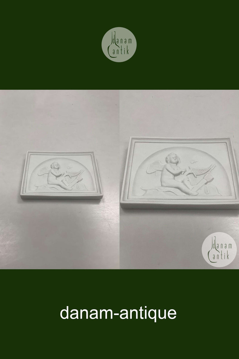 Royal Copenhagen Porcelæn Biscuit Platte Amor Virker et Net No 82. Kopie von 1852 nach Thorvaldsens Original aus Rom von 1831, Maße 9,5 x 13,5 cm (3,74 x 5,31 inch).