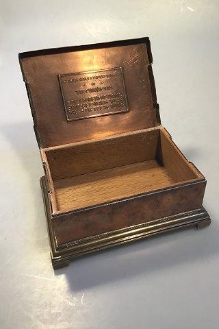 Johan Rohde für Georg Jensen. Zigarrenkiste aus Kupfer und Messing, innen aus Holz. Geprägt mit dekorativen Motiven und DFDS 1866-1916: Zum Gedenken an den 50. Jahrestag der Gründung der United Steamship Company. H. 8,5 B. 19 T. 14. cm.