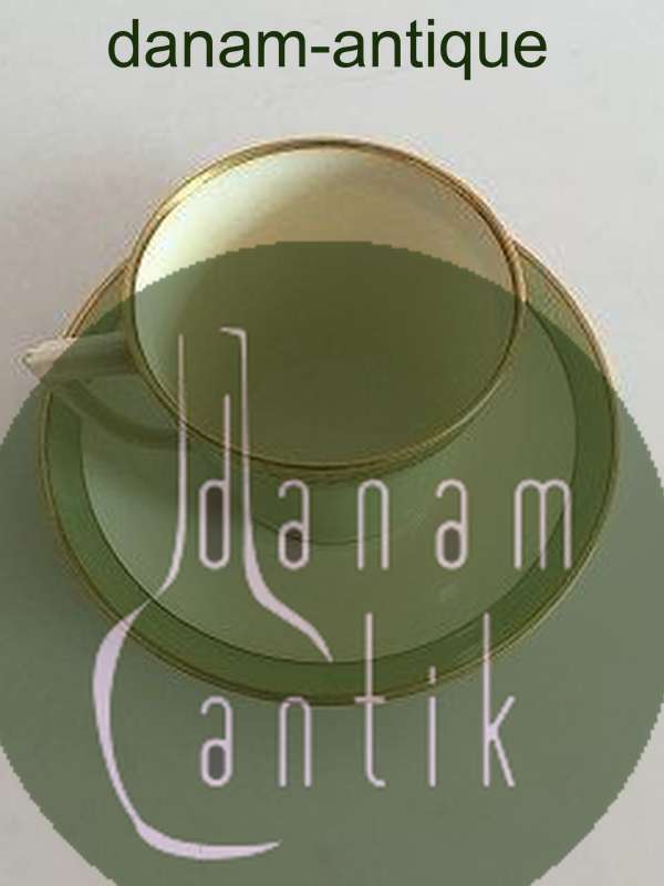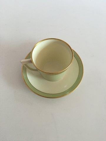 Royal Copenhagen Dagmar Kaffeetasse und Untertasse Nr. 9481. 17 cl. Pistaziengrüner und cremefarbener Rahmen mit Goldrand, entworfen von Thorkild Olsen in den 1930er Jahren.
