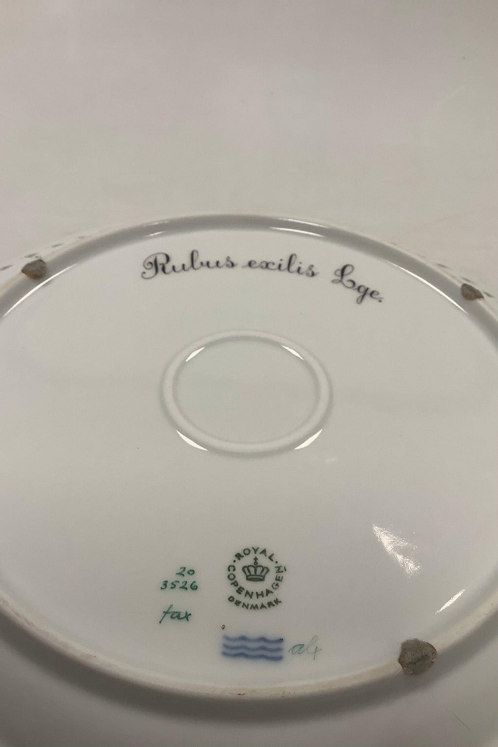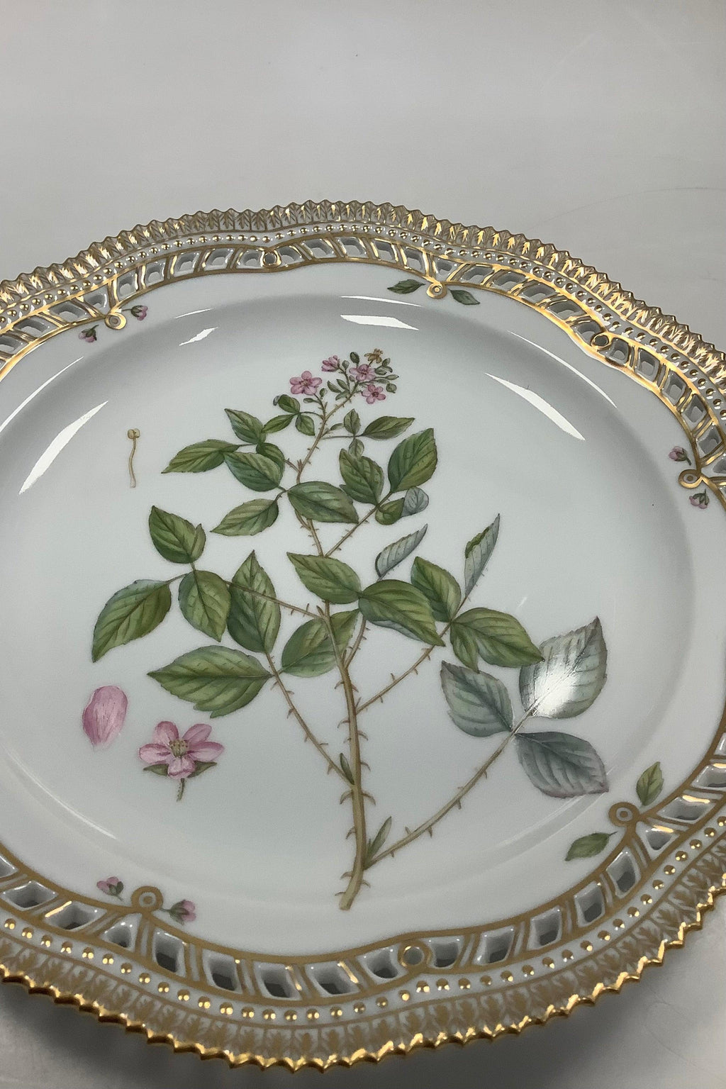 Royal Copenhagen Flora Danica Tallerken med gennembrudt kant No 20/3526. Måler 27cm / 10.63 inch. Latinsk tekst: Rubus exilis Lge