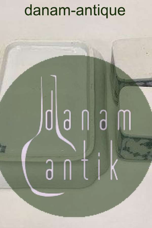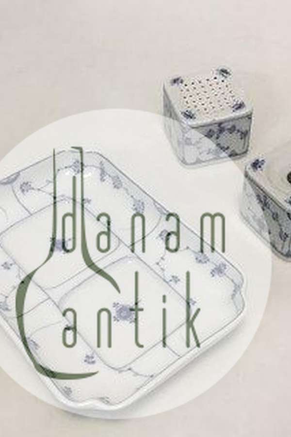 Temporäres Royal Copenhagen Muschelmalet Riflet Gammelt Tintenhaus bestehend aus Tablett und Behälter für Tinte und Sand. Maße 21,5 cm x 15 cm