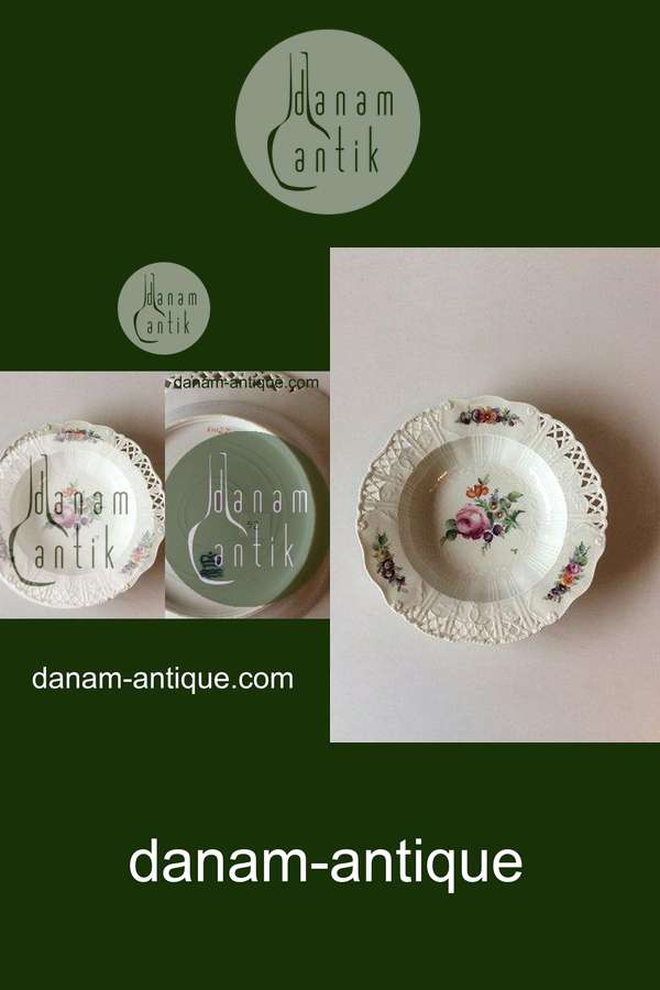 Royal Copenhagen Saxon Flower Deep Teller in Luxusausführung mit durchbrochenem Rand. Maße 24,5 cm. Da der künstlerische Leiter Arnold Krogh um 1900 die Qualität des Dekors der Sächsischen Blume und der Flora Danica steigern wollte, wurde dieses Set mit besonders kräftigen Farben und von den besten Malern hergestellt. Jedes Stück ist einmalig signiert. Das Set wurde zu einem viel höheren Preis als die anderen Sets verkauft. Das Set wurde zwischen 1904 und 1908 hergestellt.