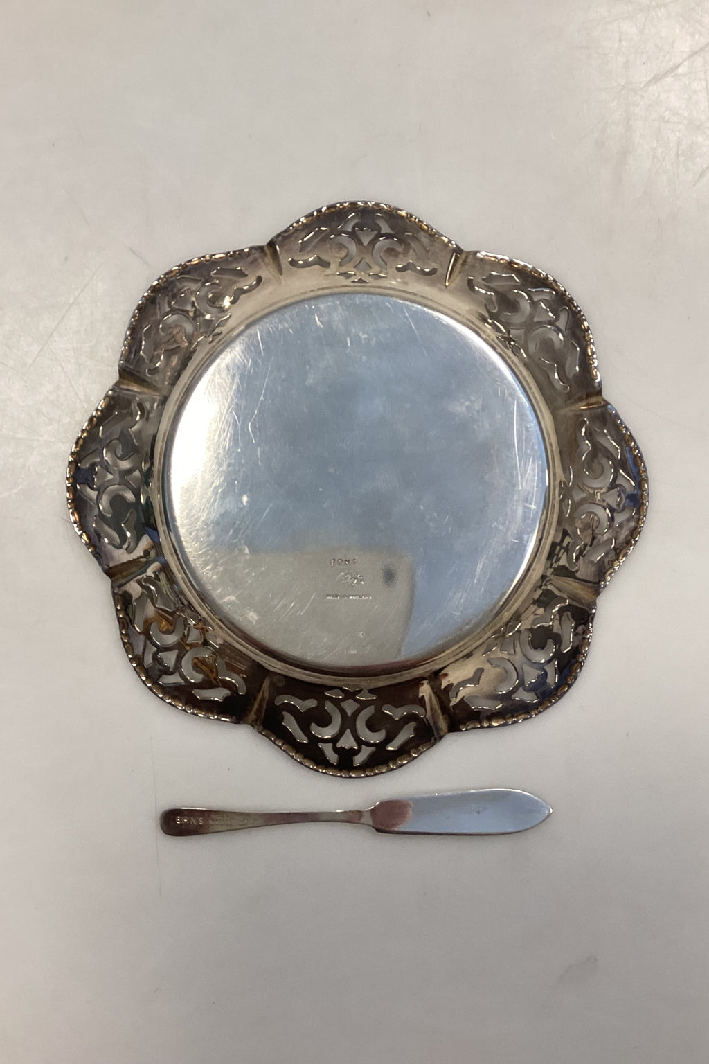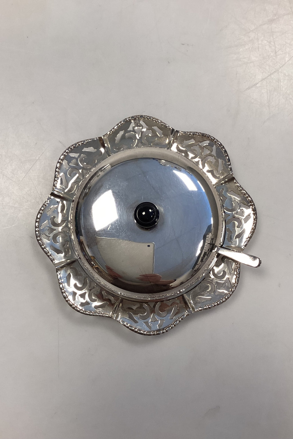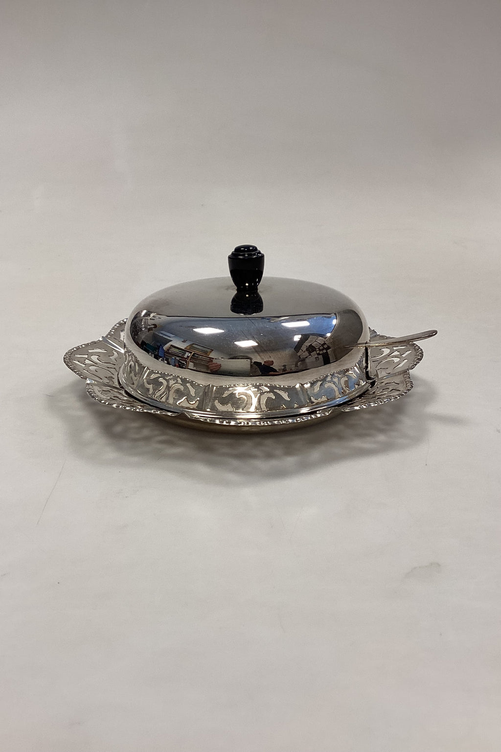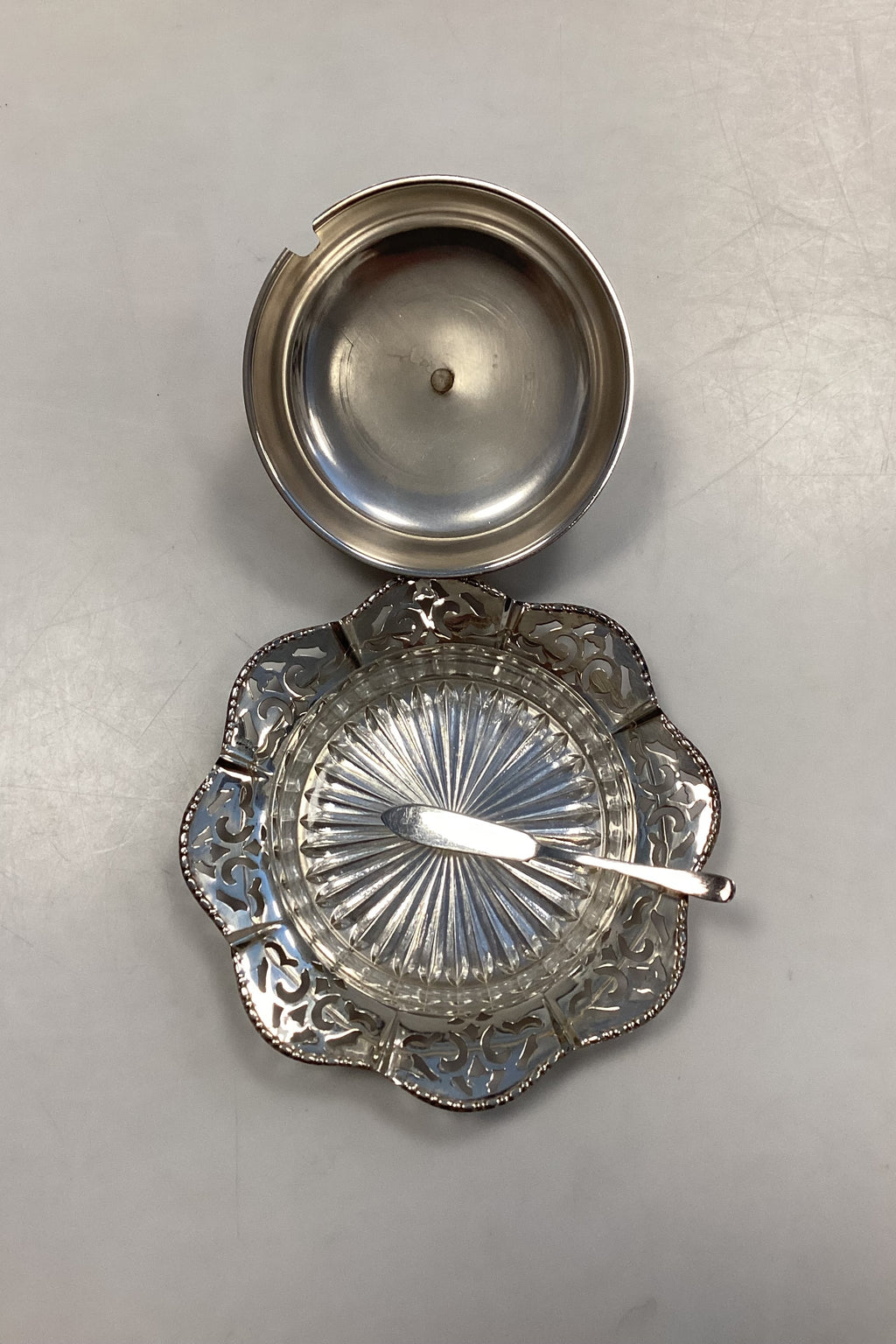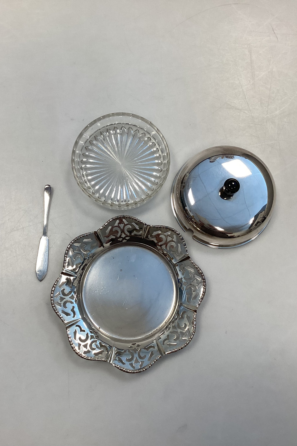 E.P.N.S. de Montfort Sølvplet Smørskål med glasskål og smørkniv. Designet i Sheffield, England.