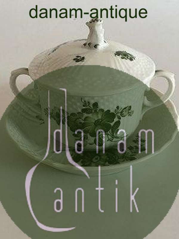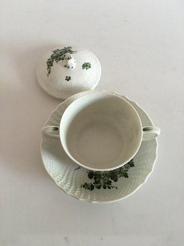 Royal Copenhagen Green Flower Welded Bouillon Cup, Deckel und Untertasse Nr. 110/1552. Die Tasse misst 12,5 cm und ist 9 cm hoch. Untertasse 13,6 cm. Vollständig und in gutem Zustand.