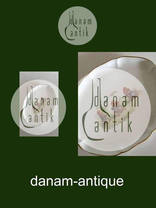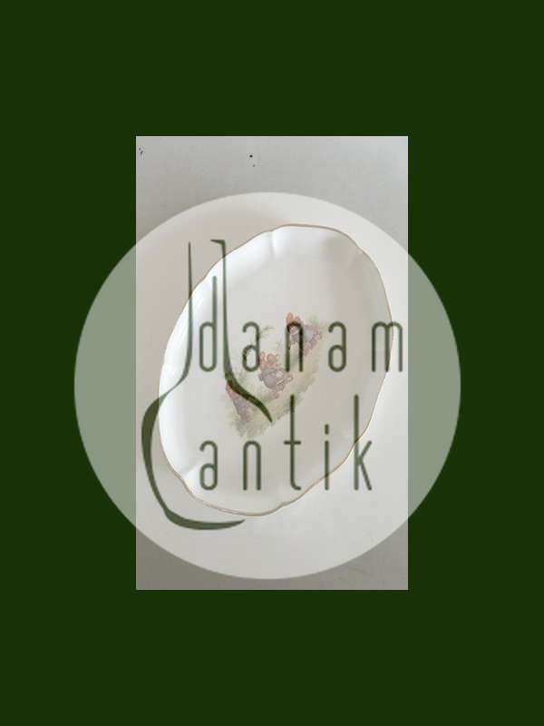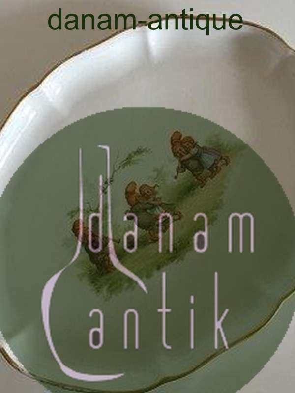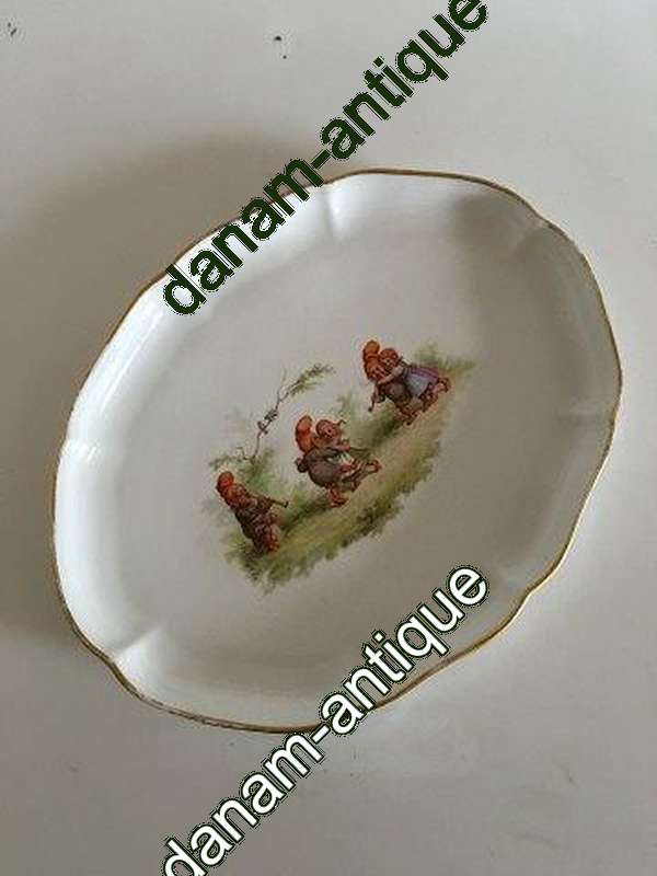 Ovale Tortenplatte mit flötenspielender Elfe und zwei tanzenden Elfenpaaren. 35 x 27,5 cm. Das Gold am Rand ist abgenutzt, aber ansonsten ist die Schale in gutem Zustand ohne Chips oder Risse.