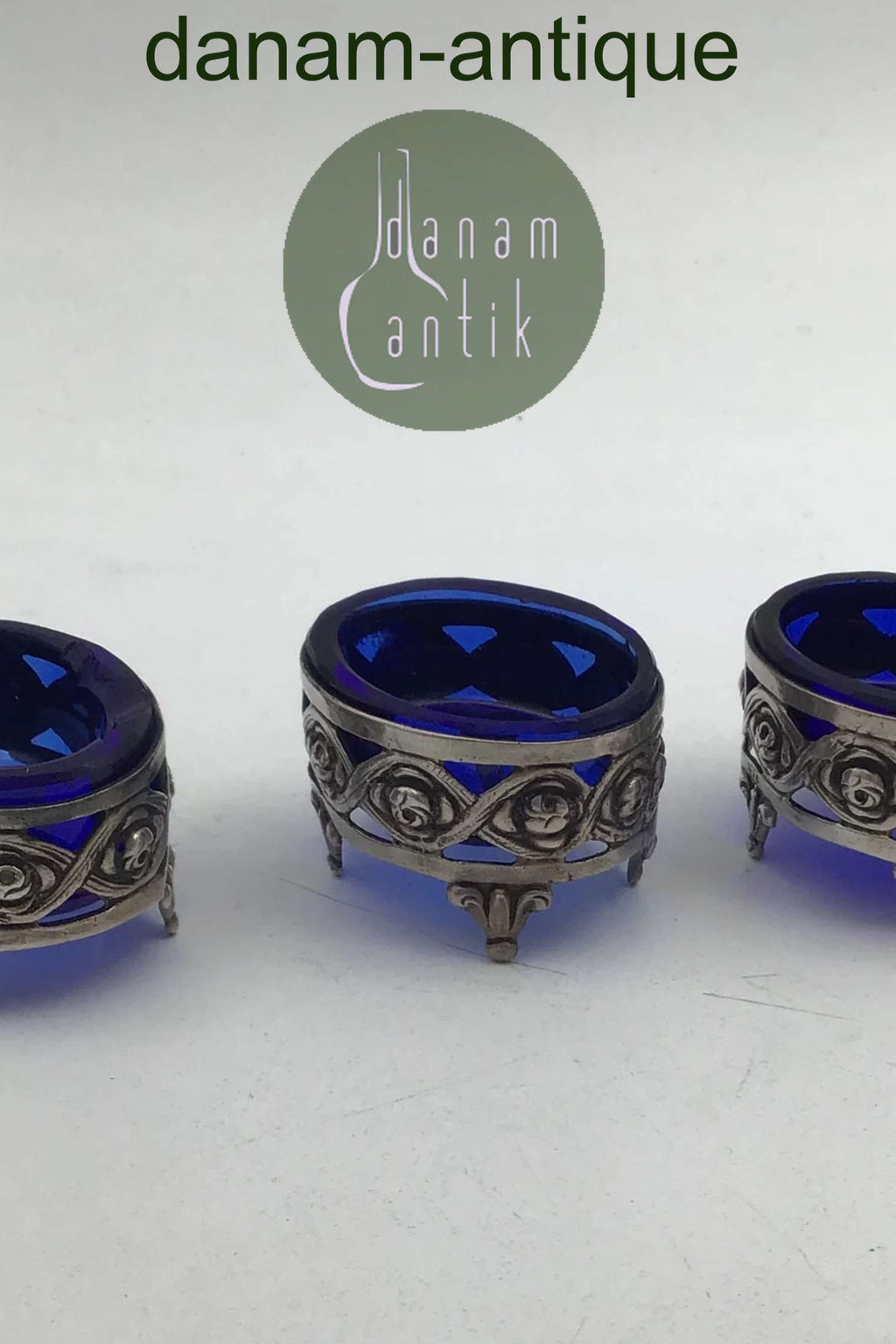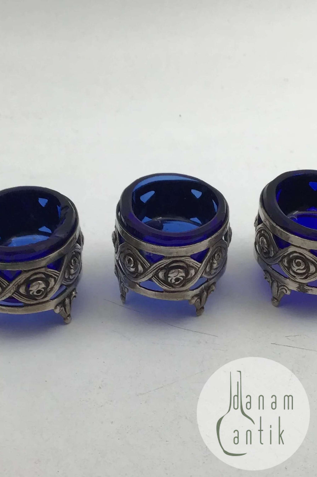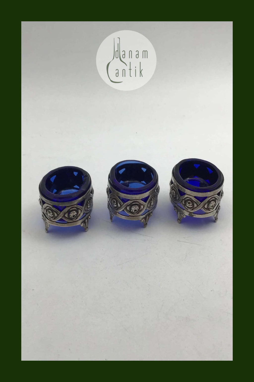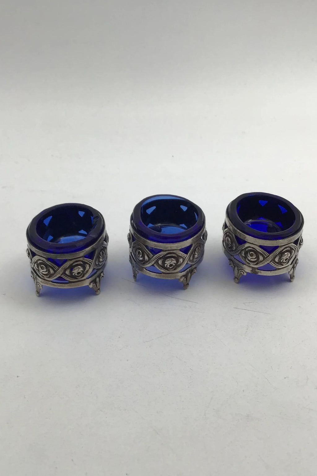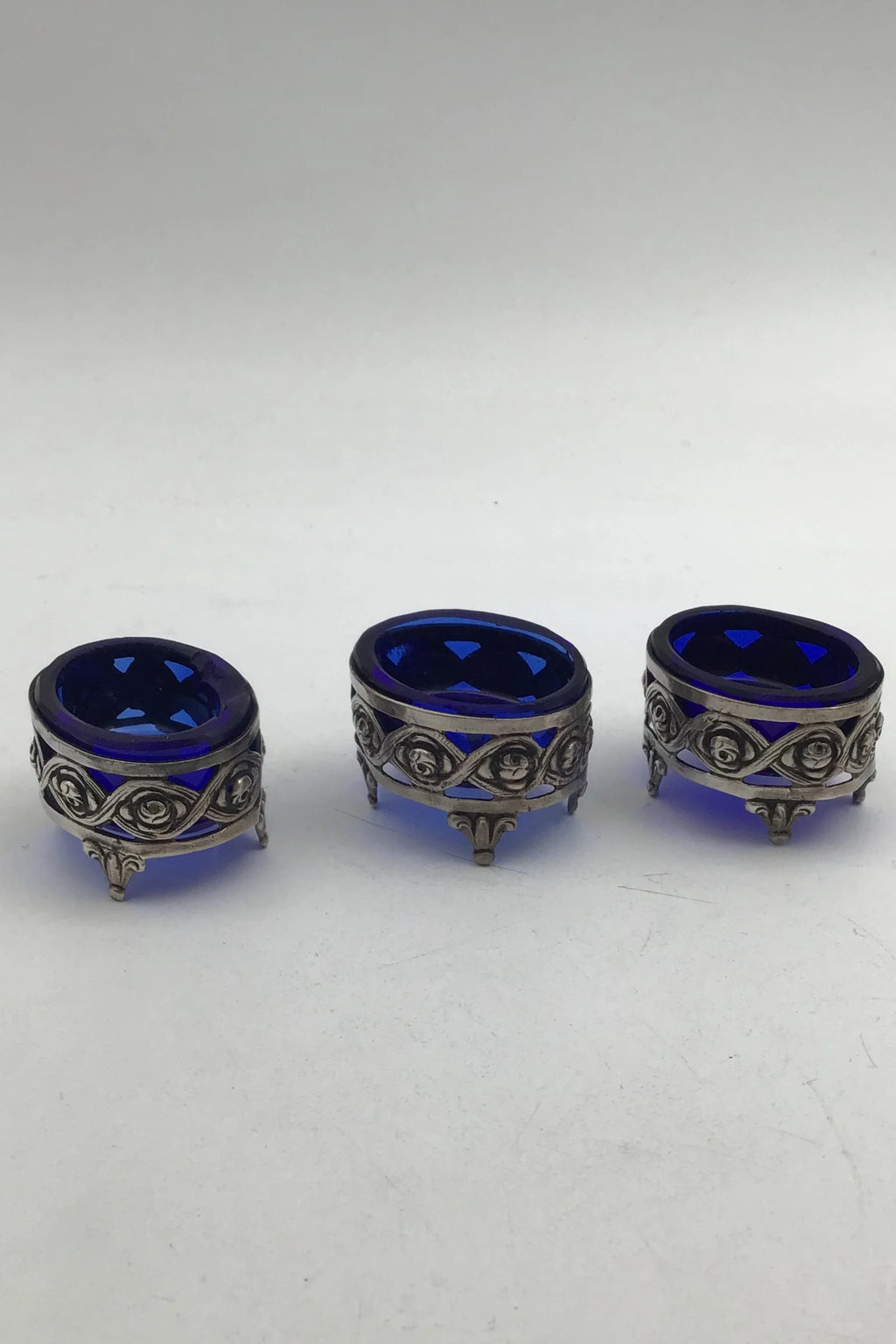 Sølv Saltkar Sæt (Blå glasindsats) (2+1) Måler 3.5 cm x 2.8 cm (1.37 inch x 1.10 inch) Samlet vægt 66.4 gr (2.34 oz) (En er skåret)