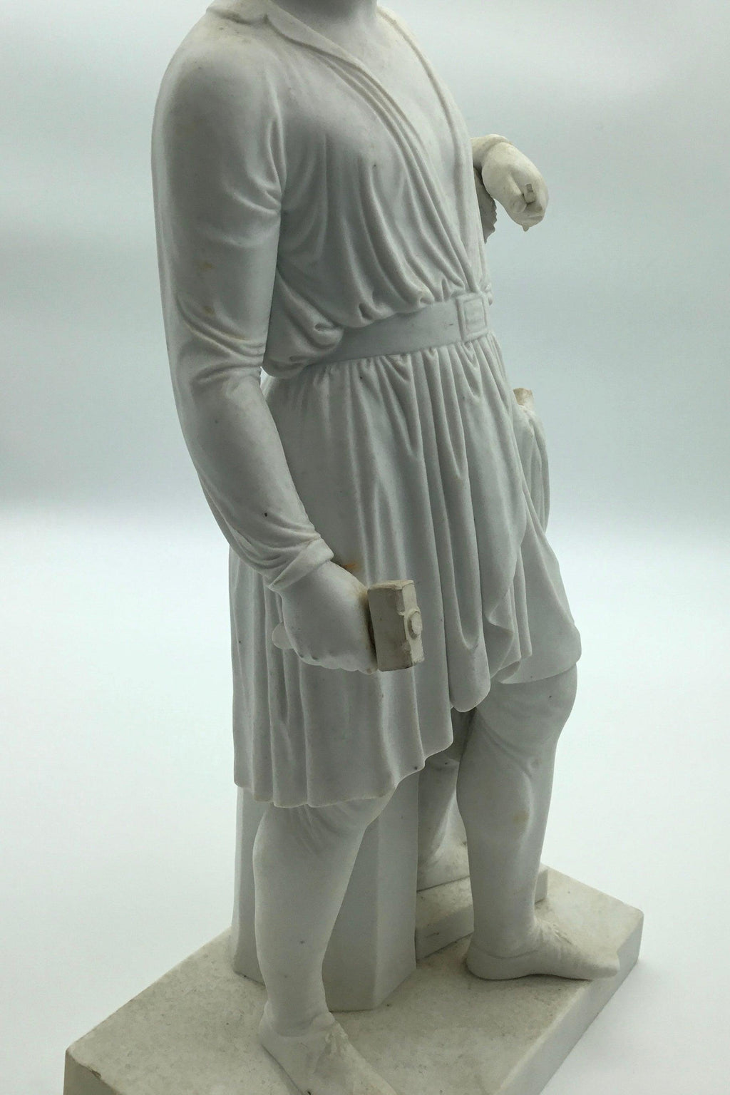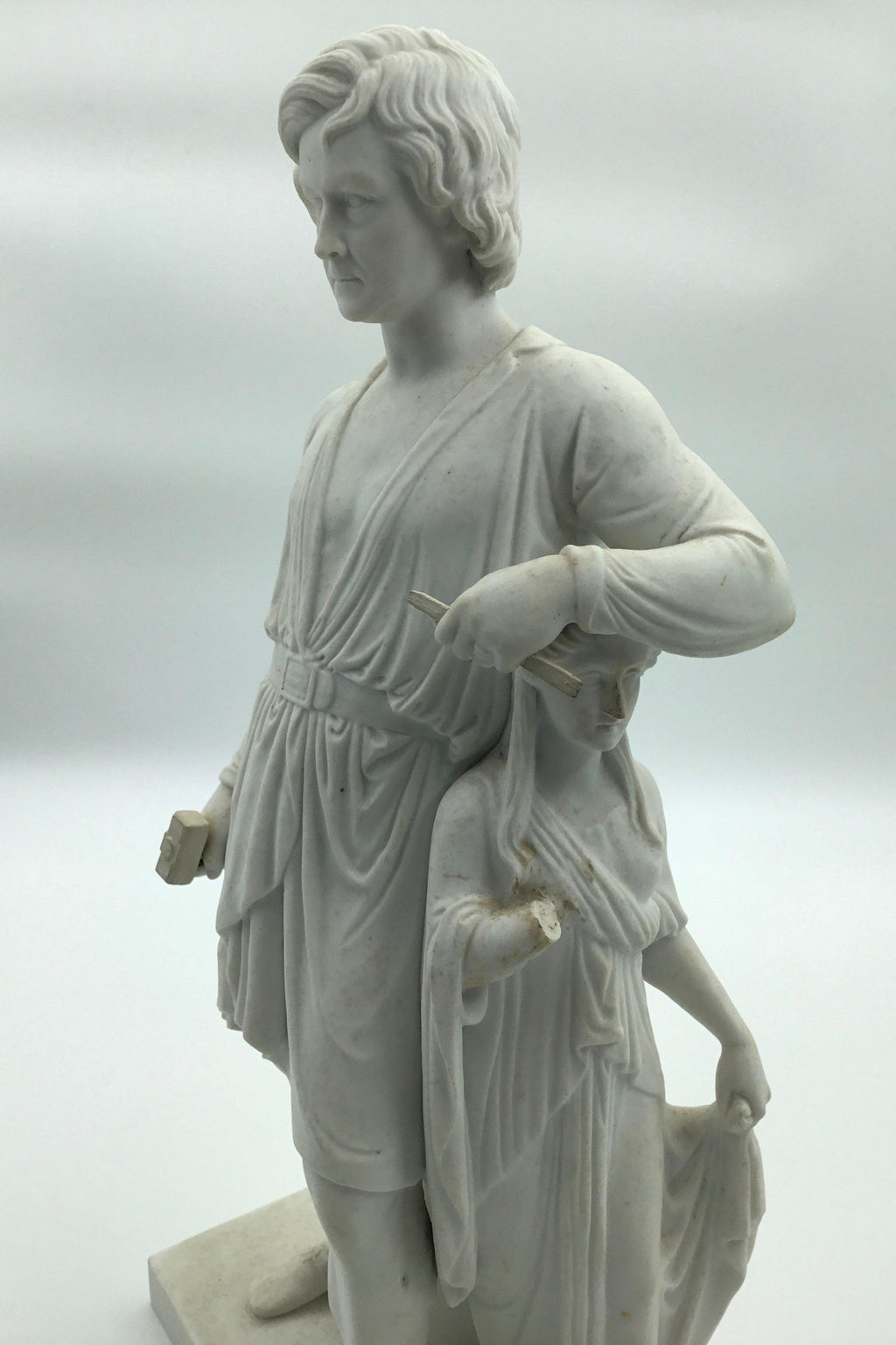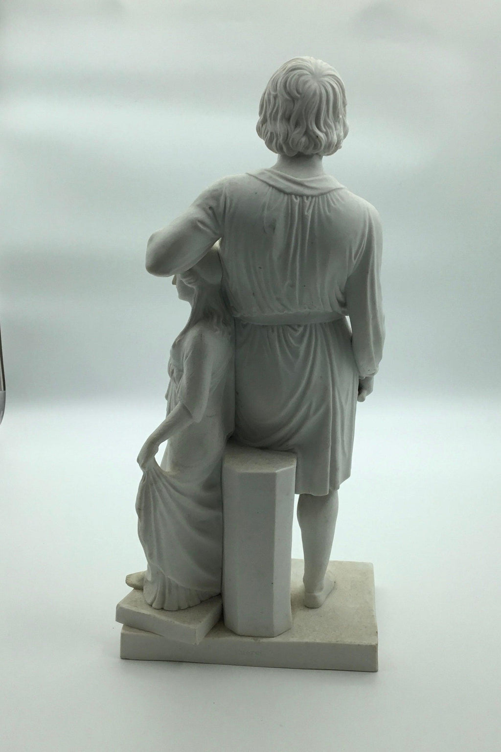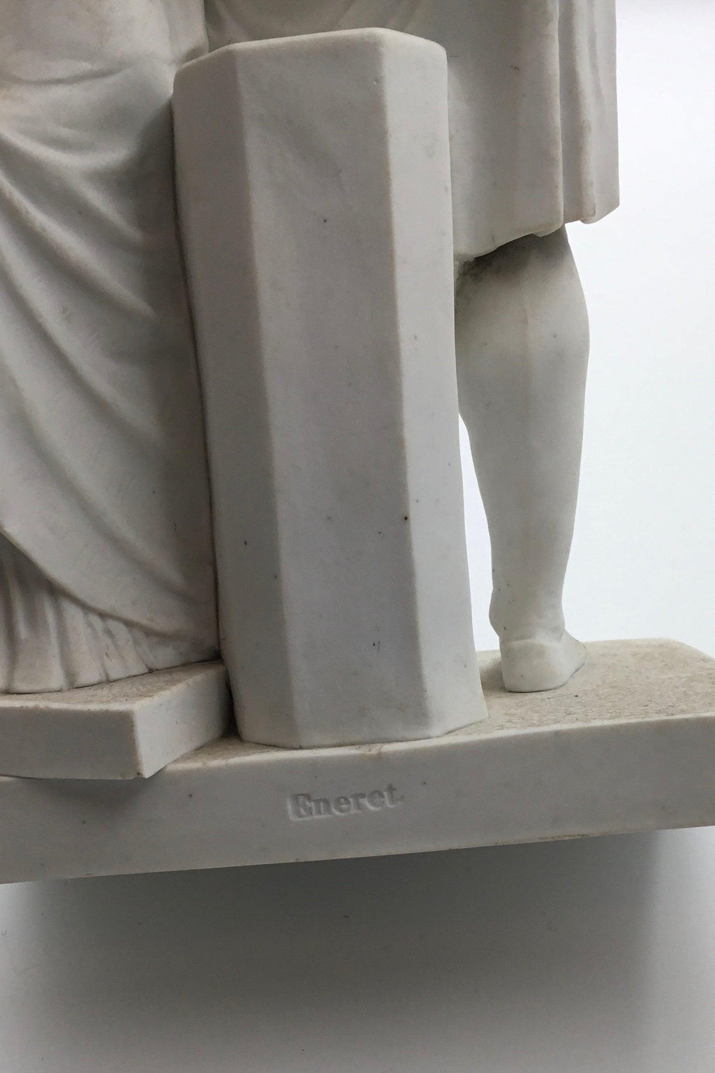 Royal Copenhagen figurine in bisque: Bertel Thorvaldsen with Hope. Defective and restored. The right hand of Hope is missing. Hammer and chisel added later ! Measures 34cm (13.38 inch)