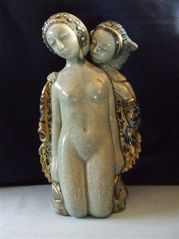 Royal Copenhagen Figur Woman with maid Servant No 1760 1 of 4 Variants. Measures 19cm and is in good condition. Designet by Georg Thylstrup. Cracle Glaze with gold.