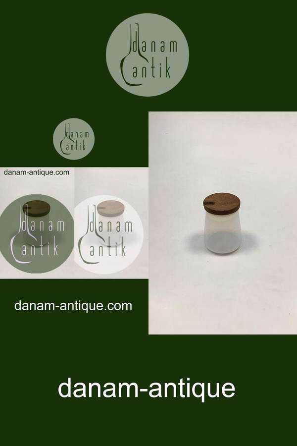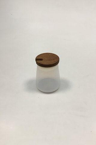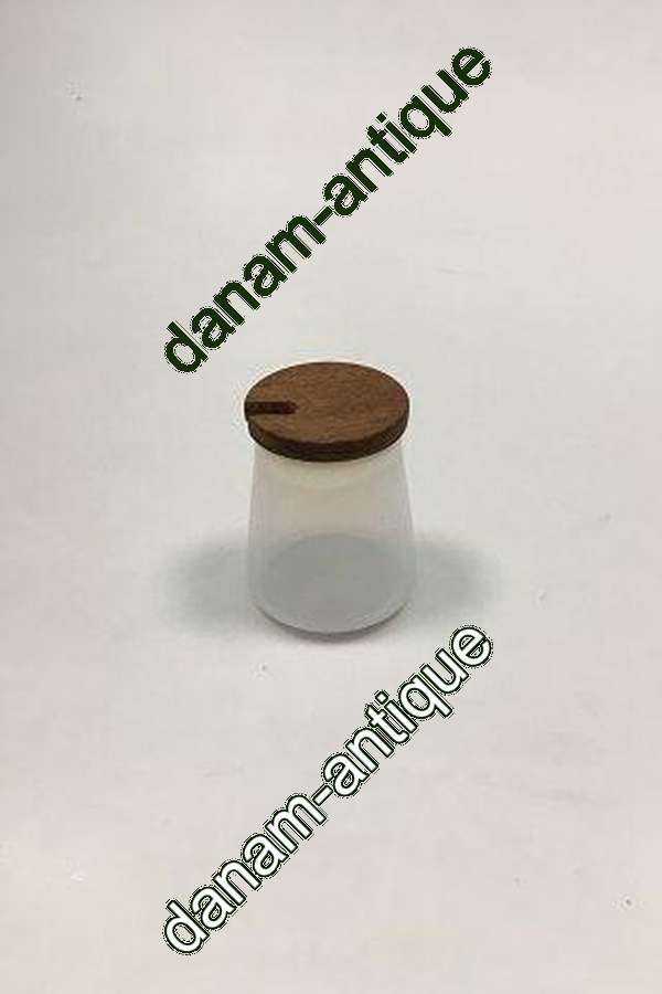 Kastrup Glassworks Opaline Mustard Cup with Lid of Teak. Jacob E. Bang. Measures 8 cm / 3 5/32 in.