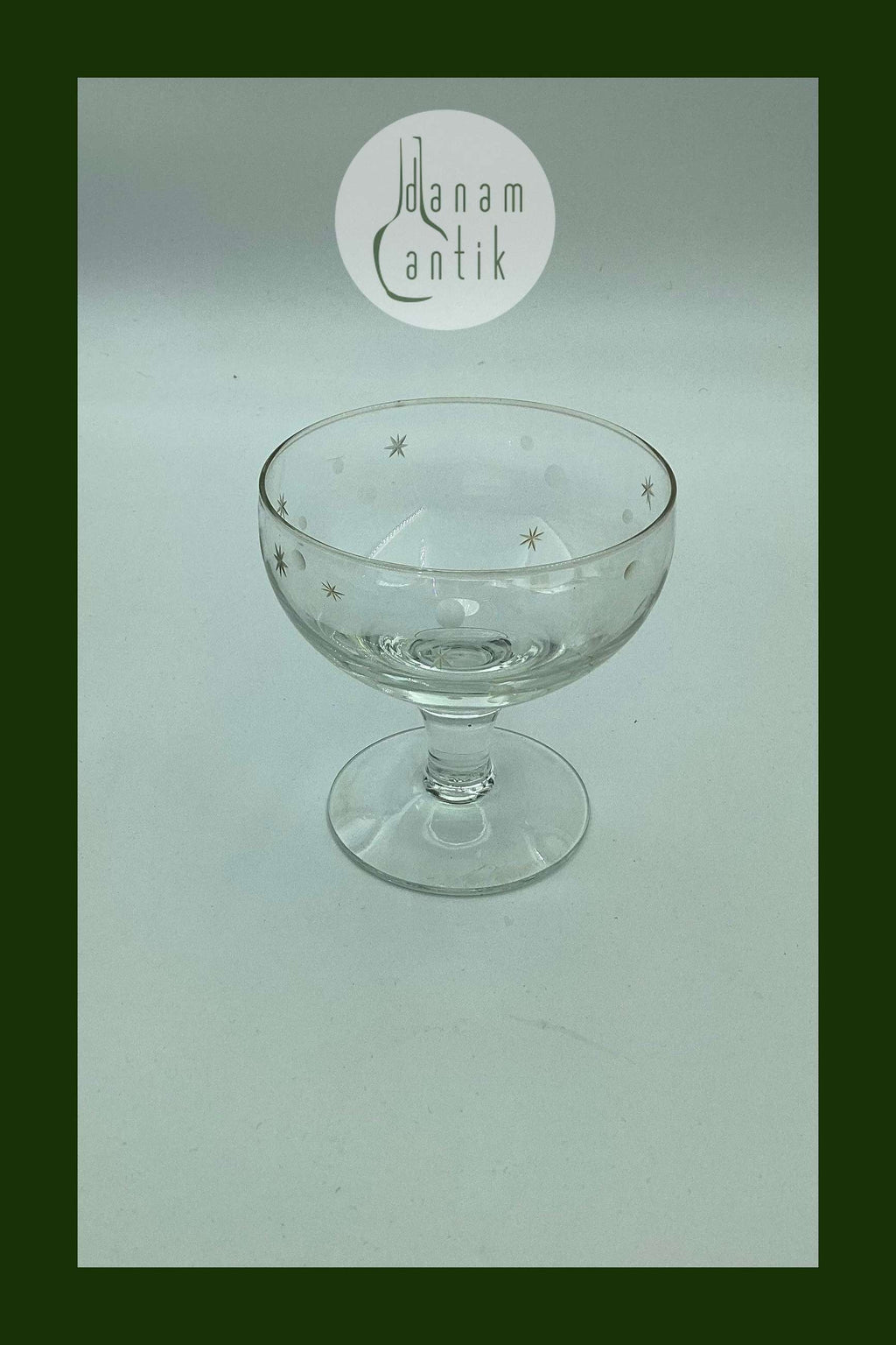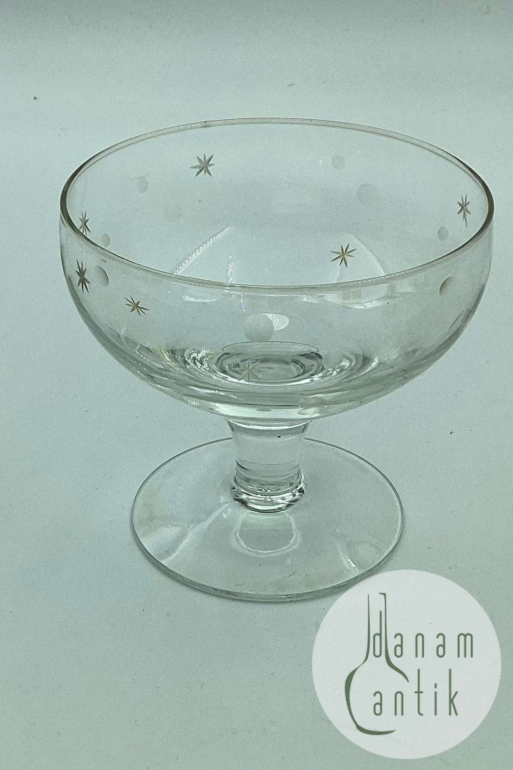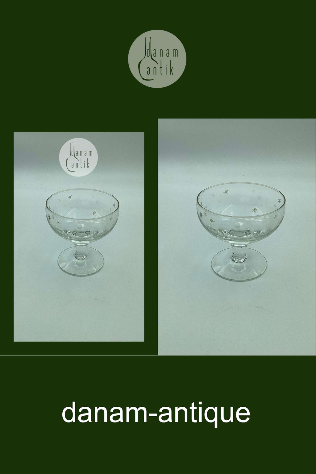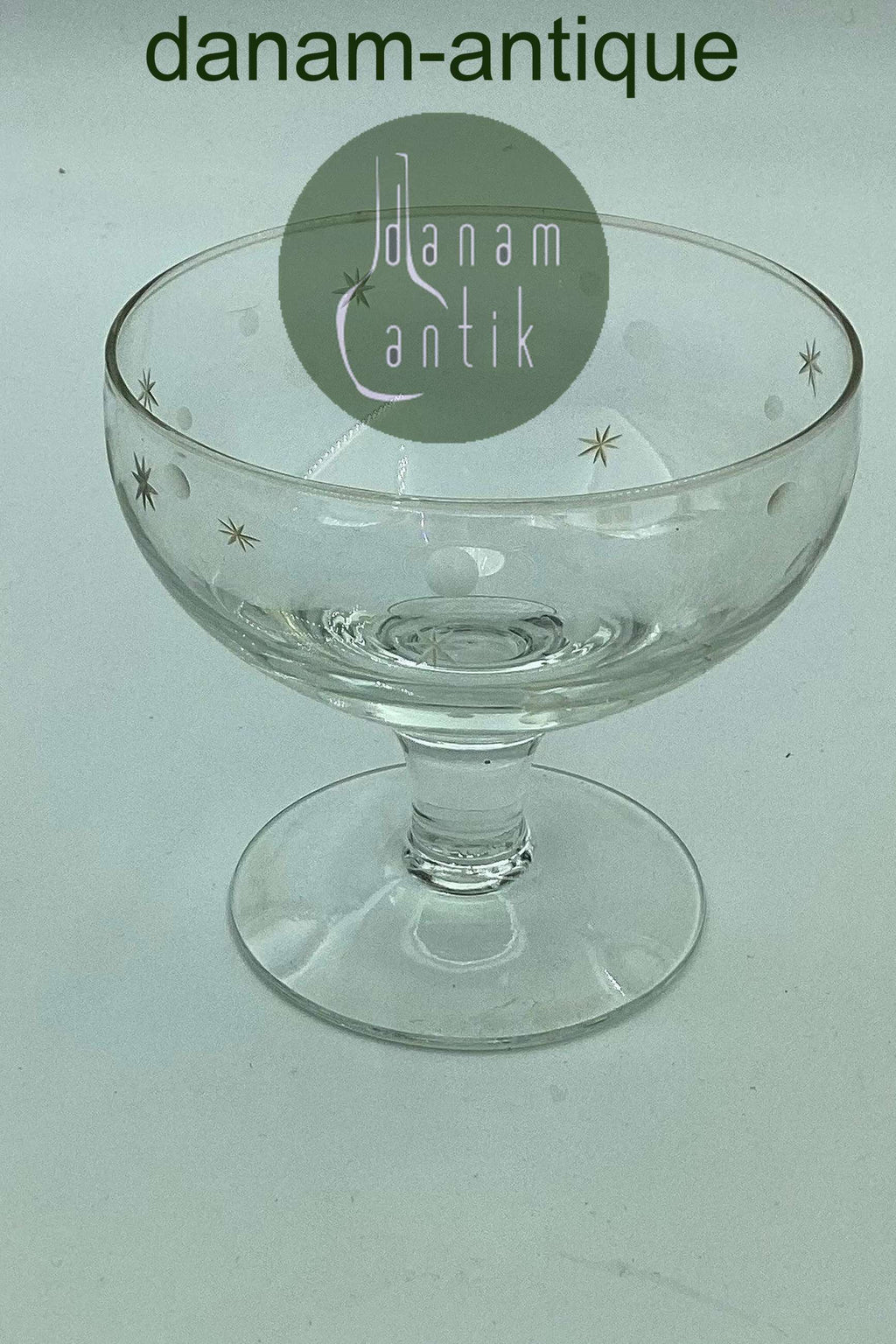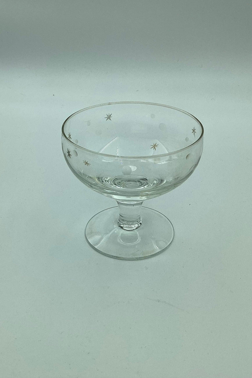 Champagne bowl in glass from Holmegaard Glassworks ca. 1930. Decorated with grindings of moons and stars. Measurements: H. 9 cm (3.54 inch) Ø. 9,5 cm (3.74 inch)