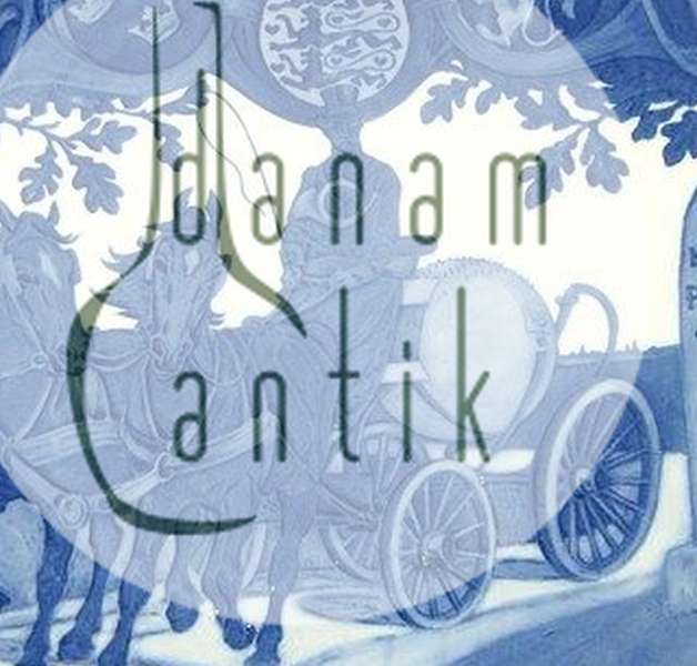 Mail coach on the Copenhagen waterfront. In the background the skyline of the town. Above the three Scandinavian arms in coach horns. To the right a milestone with inscription: DET
