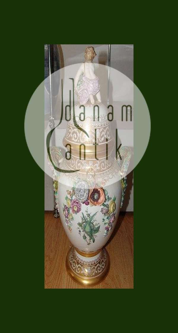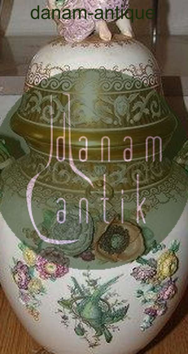 Royal Copenhagen Ornamental vase with Putti figurine 1 of 2 vases. Measures 50cm and is in good condition. Flowers has some chips. Motif is Erimitage castle.