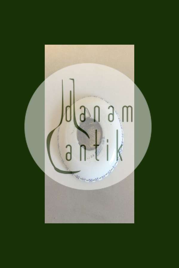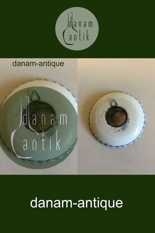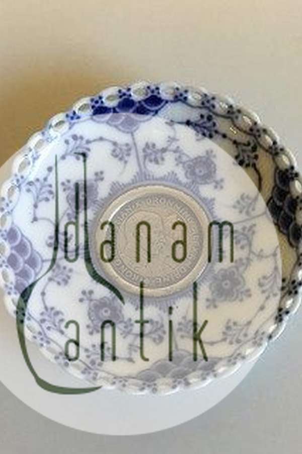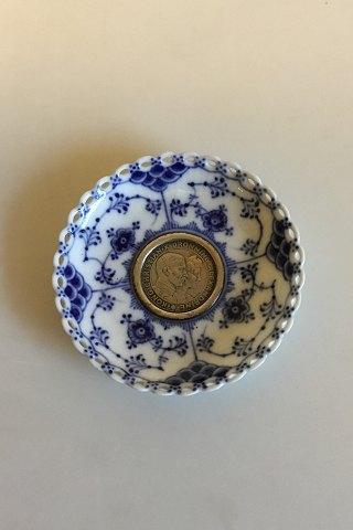 Royal Copenhagen Blue Fluted Full Lace Candle Drip Cup with 2-Crown coin with Christian X and Queen Alexandrine, 1923. No 1009. Measures 9.4 cm / 3 45/64 in.
