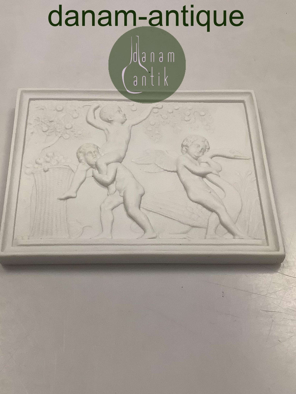 Bing and Grondahl Bisquit Cupid with a swan and boys picking fruit (summer). Copy of relief modeled in Rome in 1811. Measures 12 cm x 15 cm.