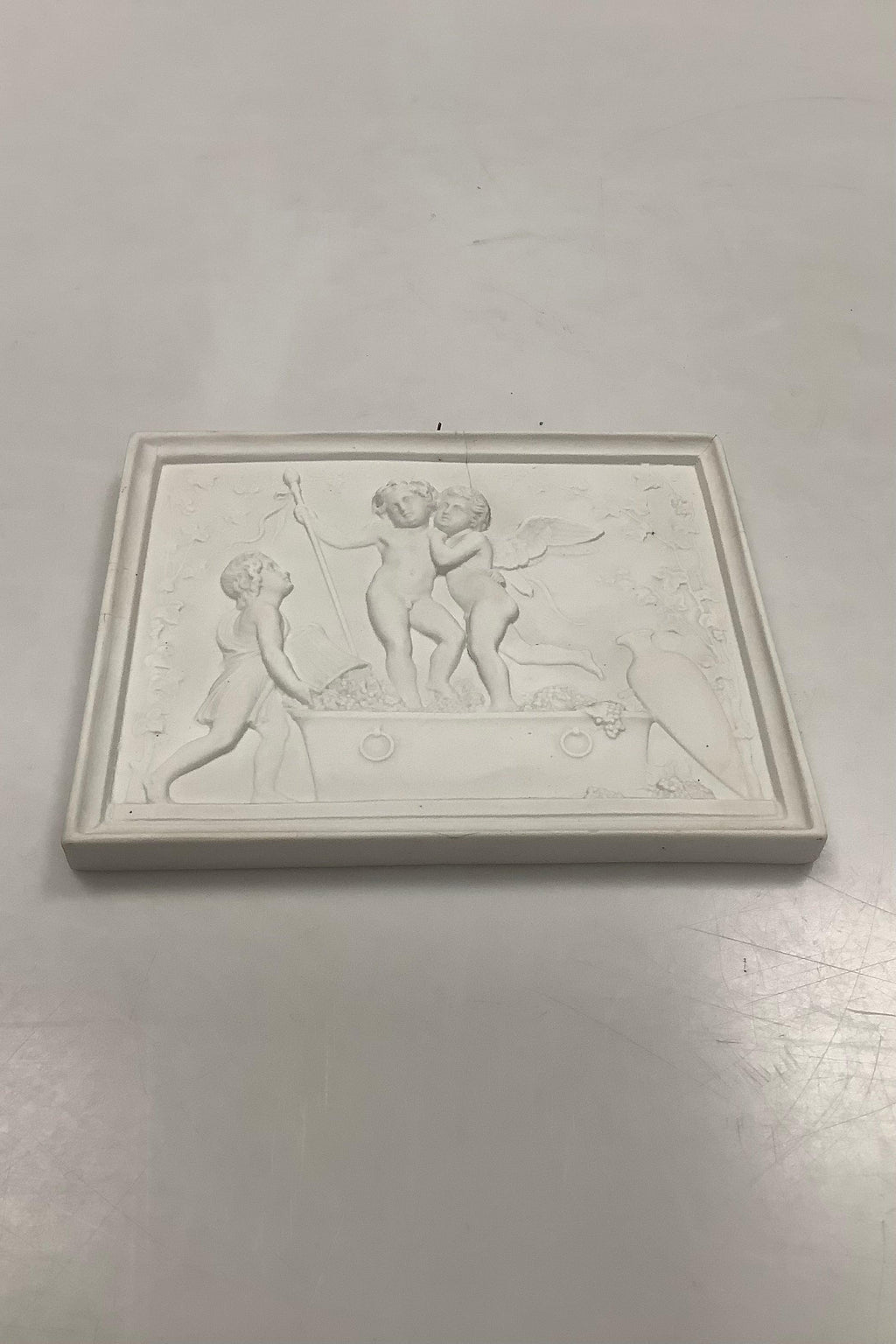 Royal Copenhagne Bisquit Cupid and the young Bacchus stomping grapes (The Harvest)". Copy of relief modeled in Montenero 1810 or in Rome 1811. Measures 12 x 15.5 cm (4.72 x 6.10 inches).