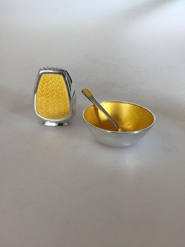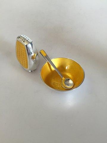 Anton Michelsen Salt & Pepper set in Sterling Silver with yellow enamel. Peppershakers height measures 5 cm (1 31/32"). Diameter of the saltbowl measures 5 cm (1 31/32"). Combined weight is 48 g (1,70 oz). In good condition.