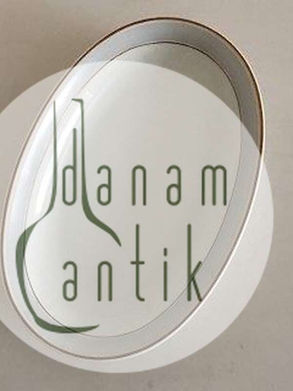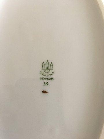 Bing & Grondahl Tiber Oval Dish No 39. 3.5 cm H (1 3/8"). 22.5 cm dia (8 55/64"). White with Light Grey Border and Gold Edge.