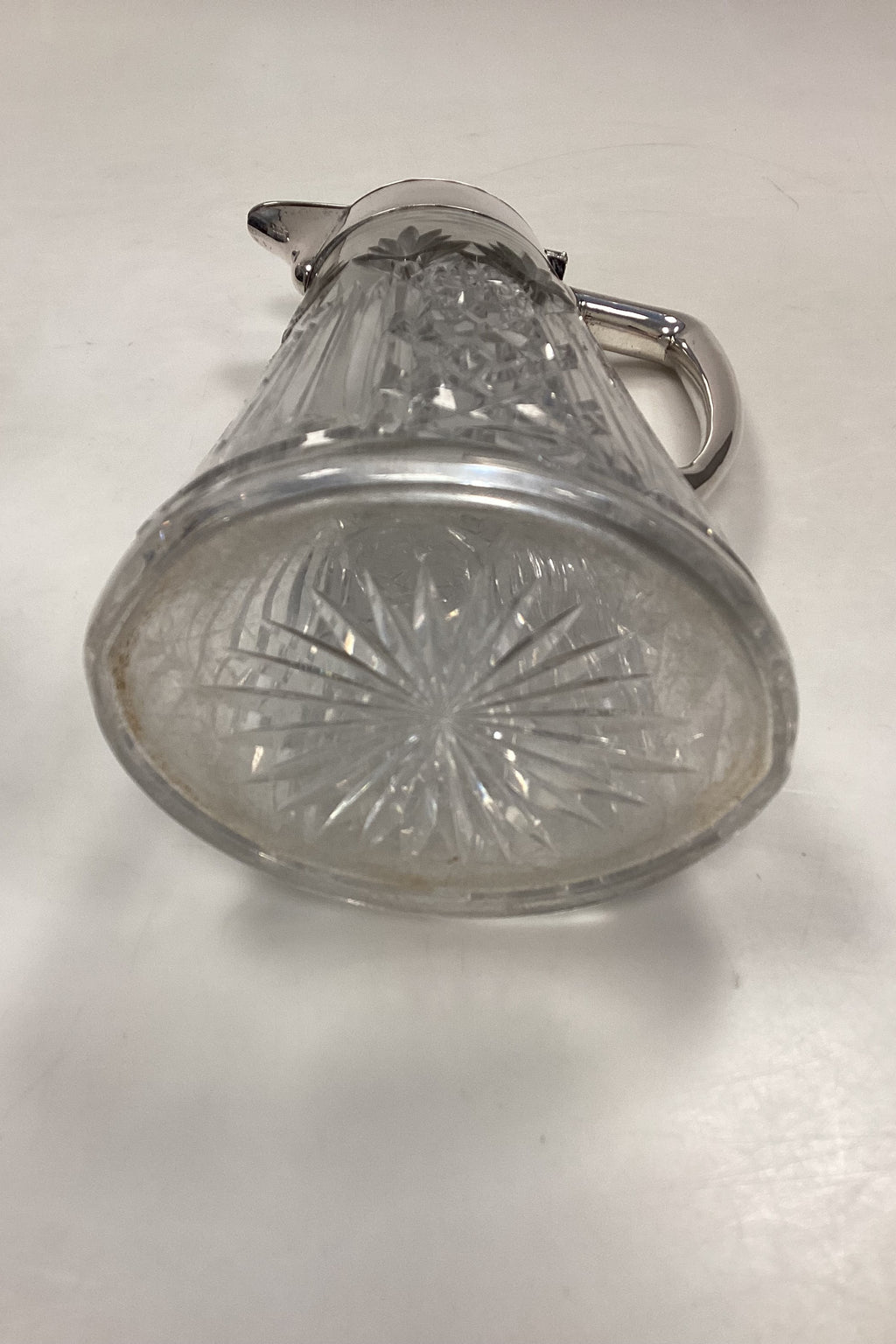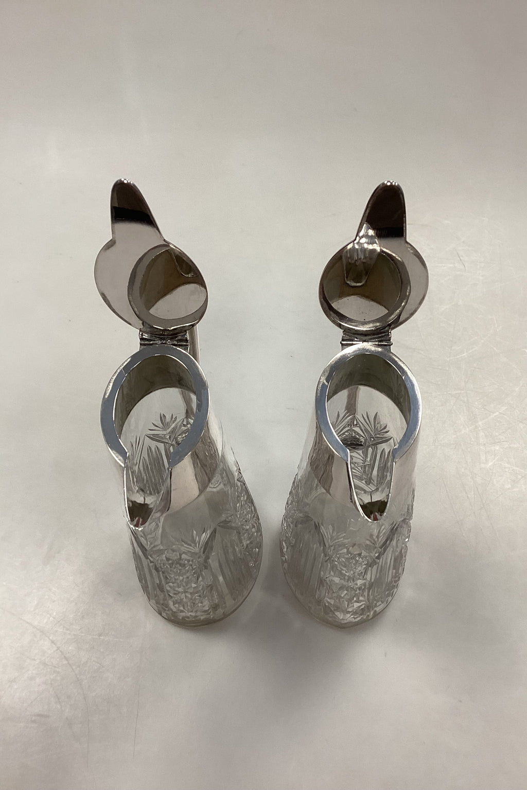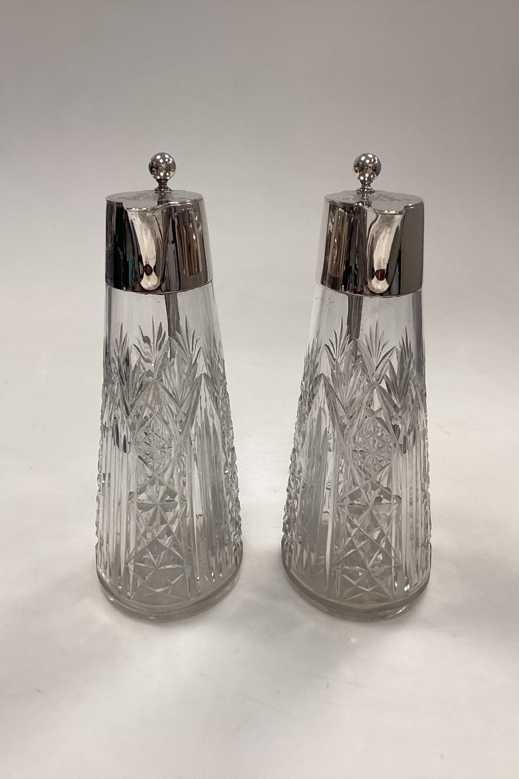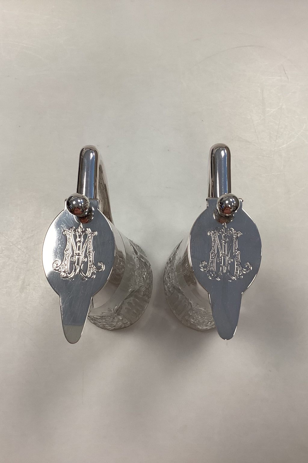 One pair of Hespe glass carafes with silver mounting. Monogram on the lid: MI. Faceted glass with oval base. Slight signs of wear, small chips on facets.