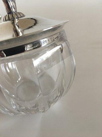 Georg Jensen Body Powder Puff No 172 in Crystal Jar with Sterling Silver Lid No 172. With arly 1920s Georg Jensen Silver Marks. The Glass and lid are in perfect condition. The powder puff looks nice, age considered. The glass measures 5.5 cm H (2 11/64") and 7 cm dia (2 3/4"). The silver pieces weighs 54 grams (1.90 oz)