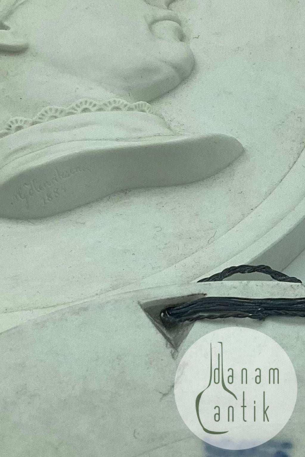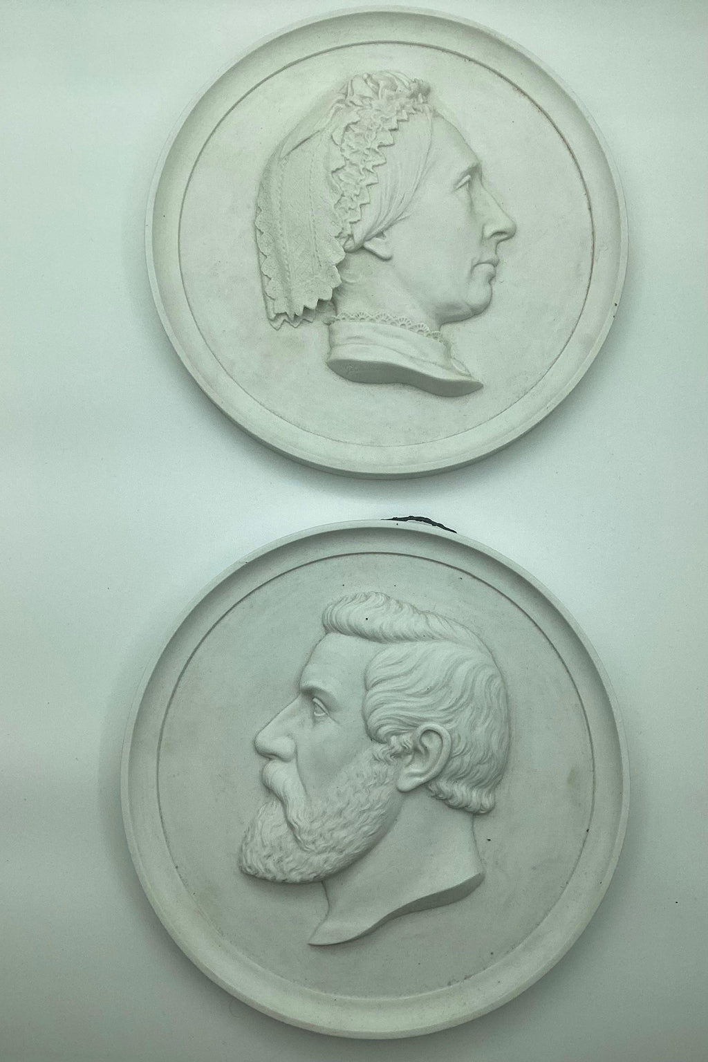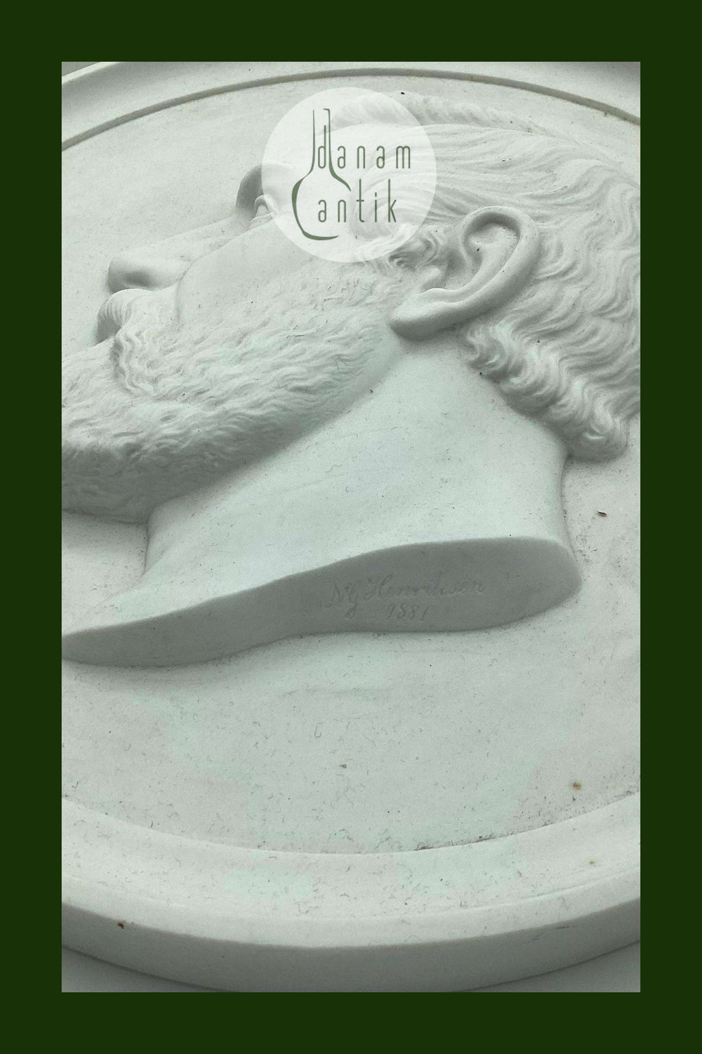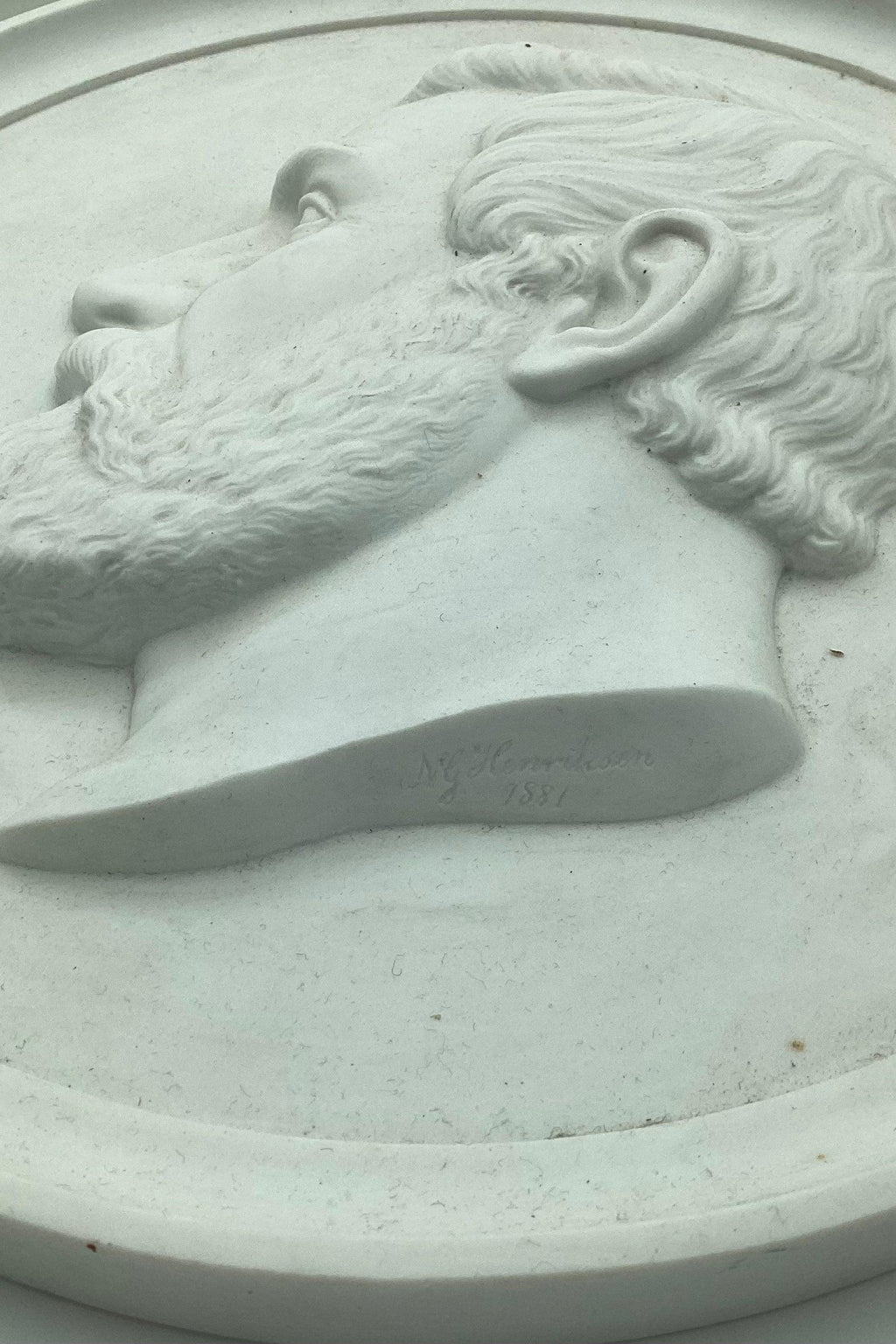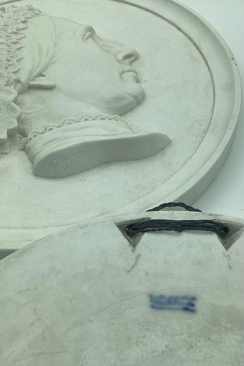 Pair of Royal Copenhagen portrait plates in bisquit by Niels Georg Henriksen 1884. Unknown pair. In the period around the production N. G. Henriksen drew motifs from the archives of Thorvaldsens Museum for the production of these plates. Both are in good condition. Both plates are signed by the artist on the neck along with the year of production, 1884. Measures 25 cm in diameter (9.84 inch)
