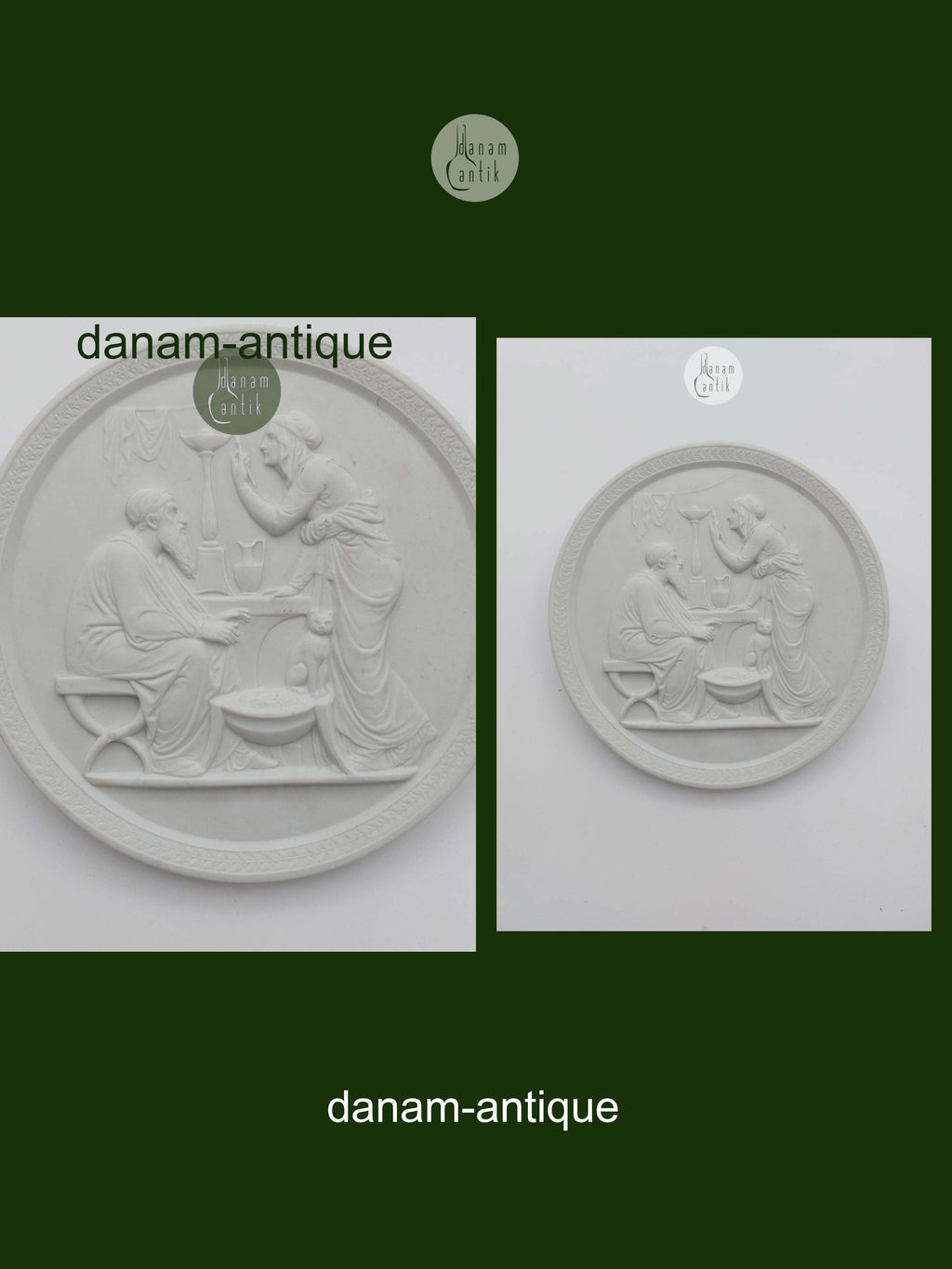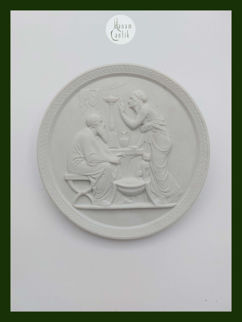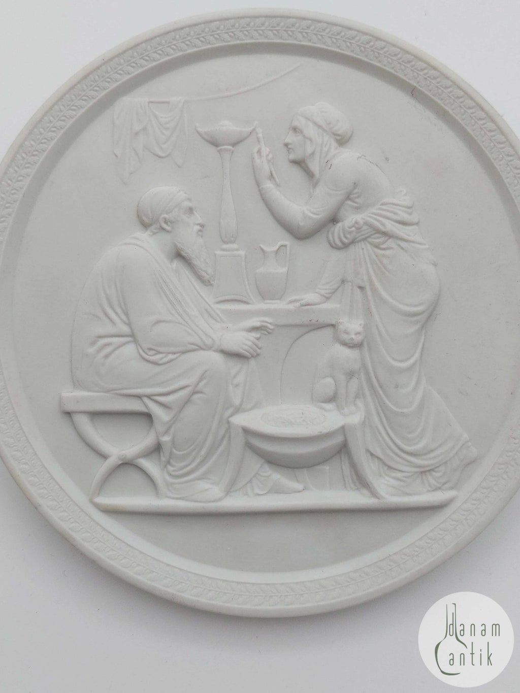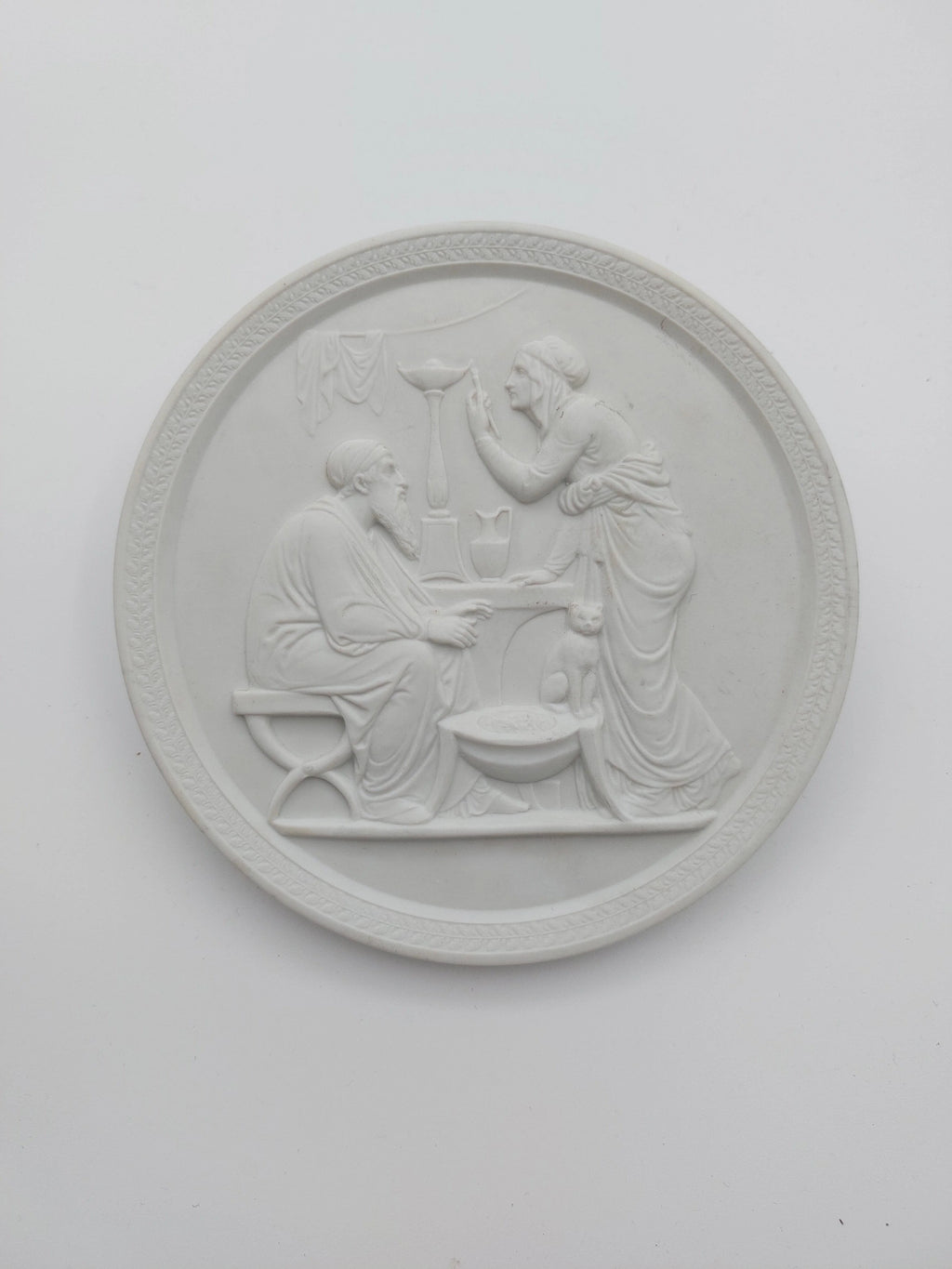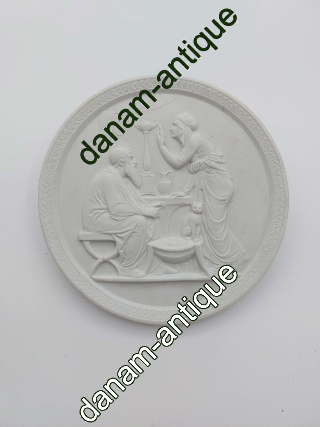 Bertel Thorvaldsen: Royal Copenhagen bisque plate "Old Age and Winter" After relief modelled in Rome 1836. Measures 14.5cm (5.70 inch). Made in the 20th century. CAN BE ORDERED WITH AND WITHOUT LEAVE DECORATION ON THE RIM !