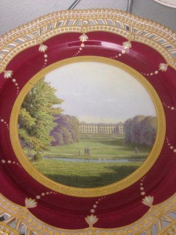 Royal Copenhagen Flora Danica Typografical Dinner Plate of Frederiksberg Castle, painted by Emil Ort and signed by him. Measures 25,5cm. From before 1900. Perfect condition.
