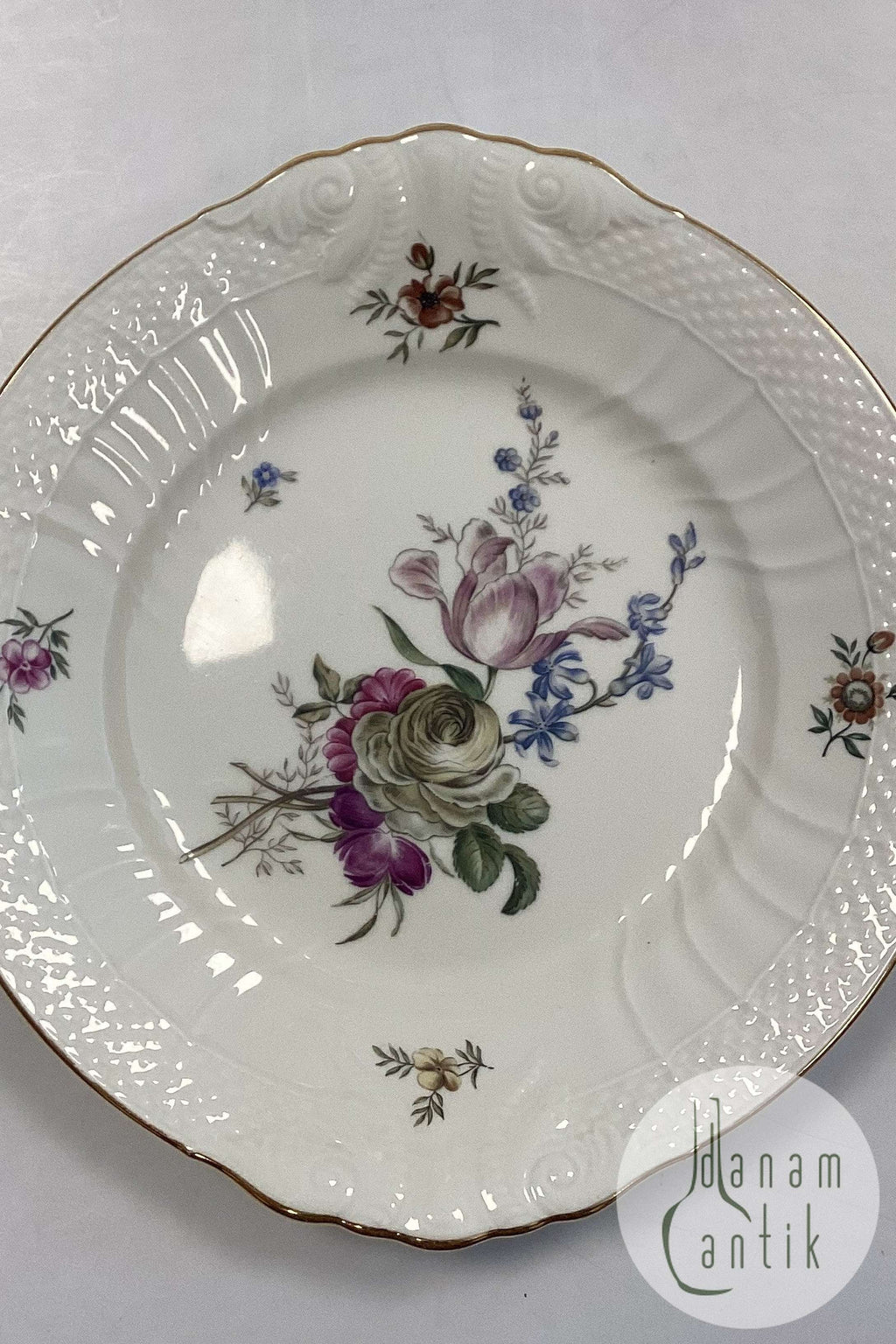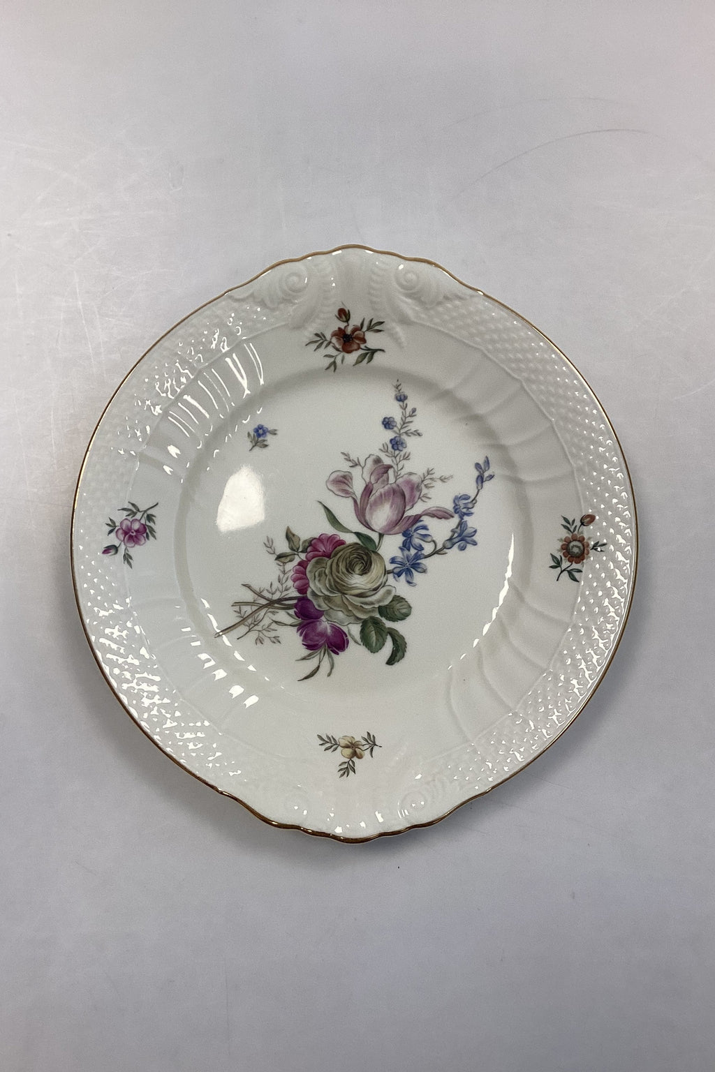 Royal Copenhagen Frijsenborg Round Cake Tray No 1864. 27 cm (10 3/5"). Creme colored with flower motifs named after the Danish nobel county of Frijsenborg.