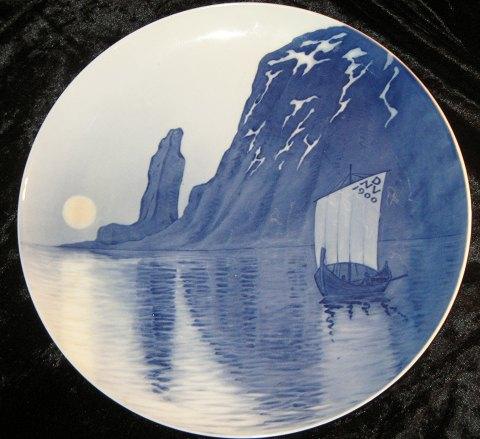 ロイヤルコペンハーゲンノルウェーモチーフの磁器製記念プレートRC-CM38。サイズは28cmで、完璧な状態です。デンマーク・ノルウェー友好協会 1900年50枚のみ製造。Nordlandsplatte。水面を背にした岩肌と、その一角に帆を張ったヴァイキング船、D.N.V.(Danish Norwegian Friendship Association)の文字と1900年の年号が描かれています。デザイン:Arnold Krog 28 cm