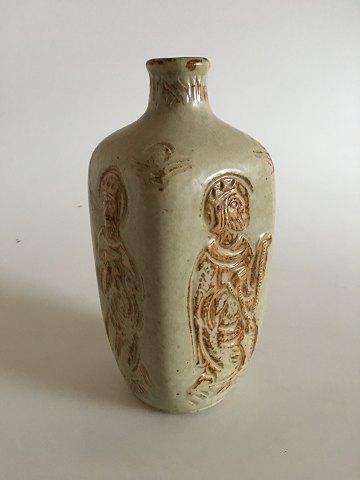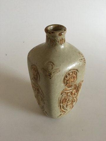 ロイヤルコペンハーゲンヤイス・ニールセン作のポーセリン・ストーンウェア・ベースは、非常に初期のものです。高さ24cm、状態は良好です。ロイヤルコペンハーゲン.Jais Nielsen, Johannes Knud Ove Jais Nielsen, 1885-1961、デンマークの画家、陶芸家。職人画家として訓練を受け、Kr.Kunstnernes Frie Studieskoler 1907-09に参加。ZahrtmannとJohan Rohde。1911年から14年にかけてパリに滞在した後、デンマークにおけるキュビスムの導入に決定的な役割を果たし、落ち着いた色調の角ばった人物画から、カラフルでフラット、装飾的な絵画へと移行し、時には『出発!』のような未来的なダイナミックさで特徴づけられる。(1918年、ストールストームス・クンストミュージアム)。1920年にイタリアに滞在した後、スンドビーの聖エリザベス病院(1928-35)やフレデリクスベルグ市庁舎(1952-56)など、現代的かつ伝統を意識したフレスコ画を制作し、いくつかの教会ではステンドグラスも描いています。ニールセンは、原始主義的な「海から昇るヴィーナス」(釉薬のかかった陶器、1917年)や、より古典的な「ポットメーカー」(炻器、1925年)などの陶芸作品で、世間に大きな成功を収めた。1917年からは自由美術展に所属し、1921年からはデンマーク王立美術アカデミーに所属していた。ポーセリンファブリーク(Porcelainsfabrik)で実用品と陶磁器彫刻を制作した。ヤイス・ニールセンは1929年にエッカースベリ・メダル、1948年にトルバルセン・メダルを受賞している。