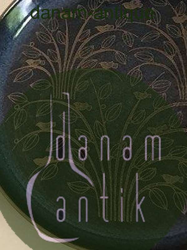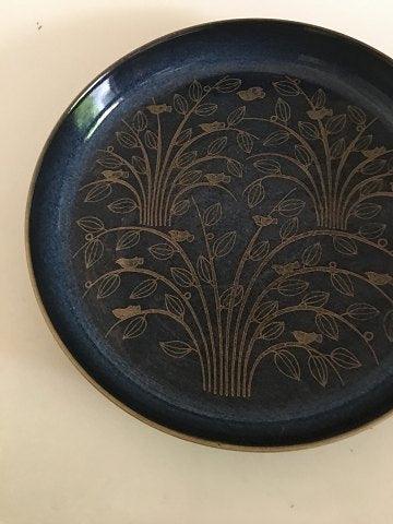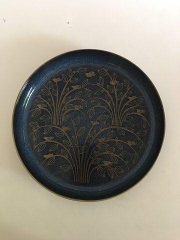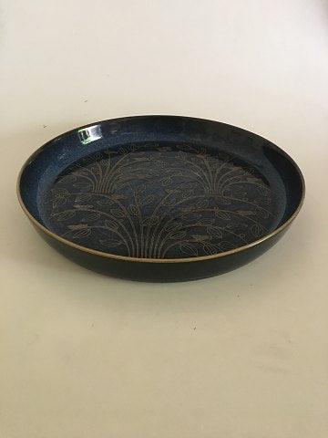 ロイヤルコペンハーゲン スノーレ・スティーブンセン ディッシュ深い青色の釉薬に茶色がかった金色の葉や枝、鳥のモチーフ。状態は良好ですが、中央部にヘアライン・クラックが数本あります。直径38cmの大きさです。高さ5cmのリム。