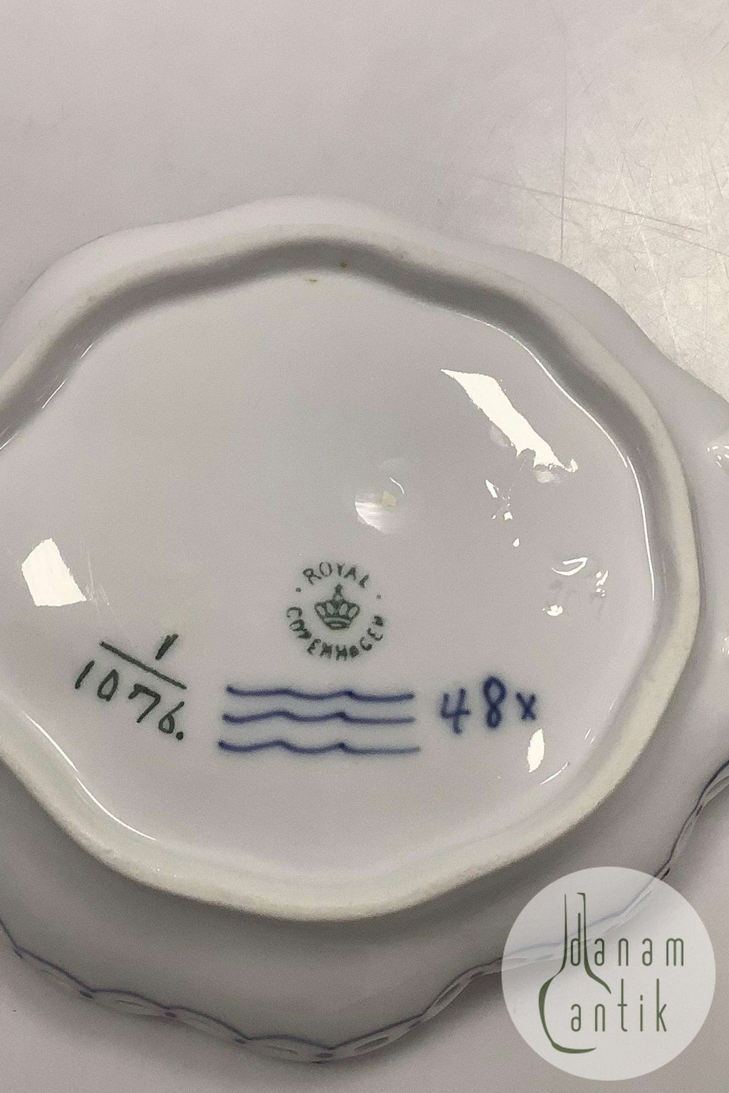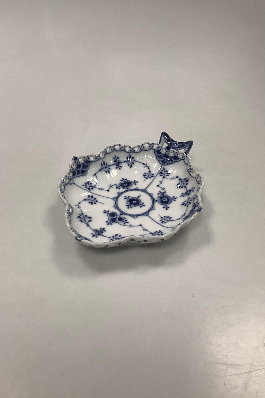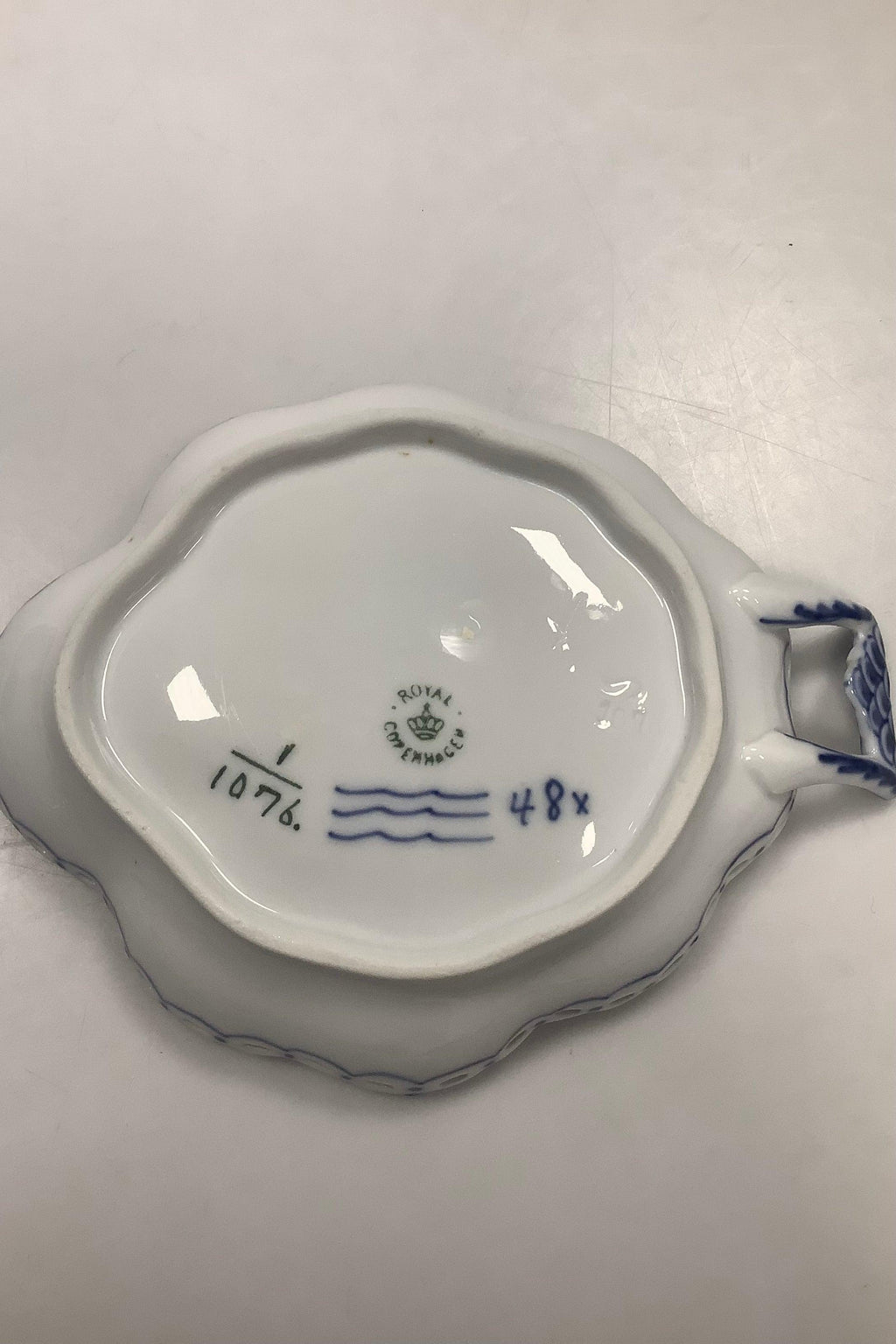 Royal Copenhagen Musselmalet Helblonde Bladformet fad No 1076. 1. sortering. Måler 18,5 cm ( 7 9/32 in. ). Har et mini afslag på spisen og en i siden