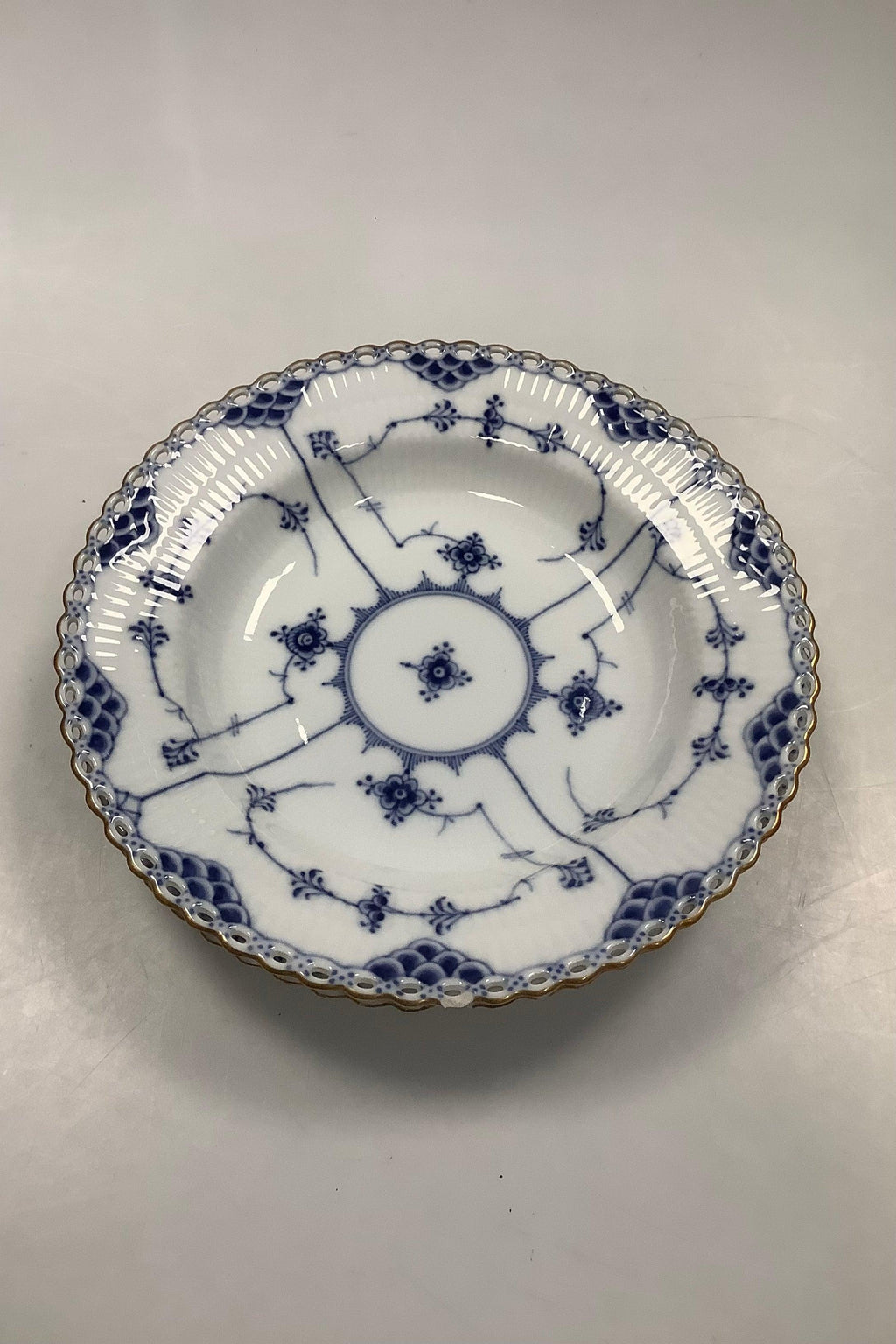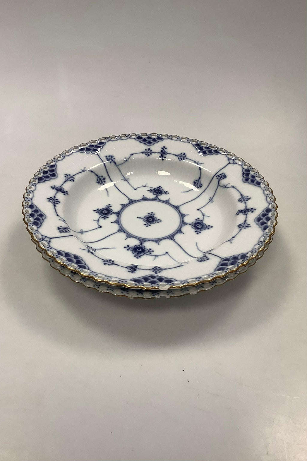Sæt på 2 Royal Copenhagen Musselmalet Helblonde Dyb Tallerken med guld No 1078. Måler 25 cm / 9.85 inch. 2. Sortering.Alle med afslag